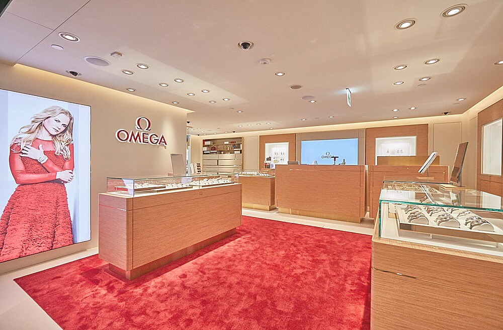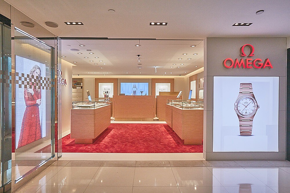 OMEGA全新形象概念店,首間就選在遠東SOGO復興店盛大開幕,店內運用大量原木色為主軸,點綴上高雅香檳金燈飾,並結合奢華紅色地毯,來呼應OMEGA品牌經典色調。