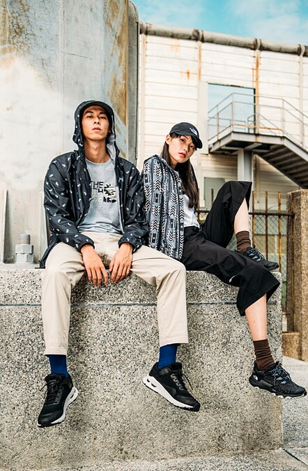 男-〈全LOGO印花風衣外套、迷彩印花短袖T恤、防水透氣徒步鞋〉
