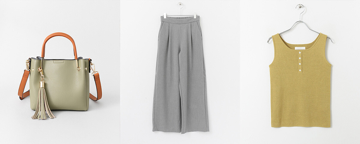 淺色調灰階色系寬褲可以淡化寬褲偏於正式的印象,只要搭配條紋或寬鬆短TEE就能擁有像法式女孩在生活中自帶悠閒品味的氛圍,加上緞帶繫綁特色帽款與鞋子同色調的巧妙協調性,佐以因新垣結衣在日劇中配戴引起瘋狂搶購的人氣話題包款,搭配出春季最怡然的出遊Style!