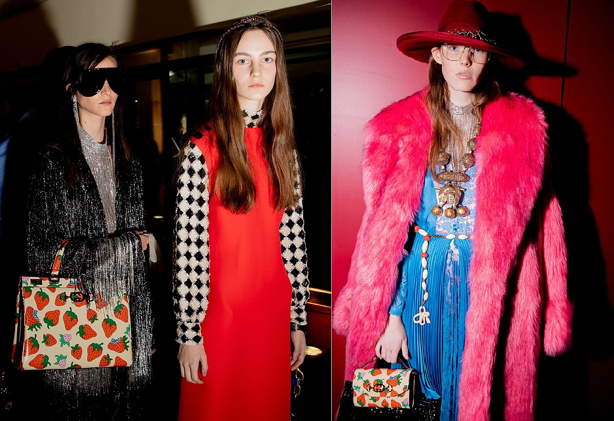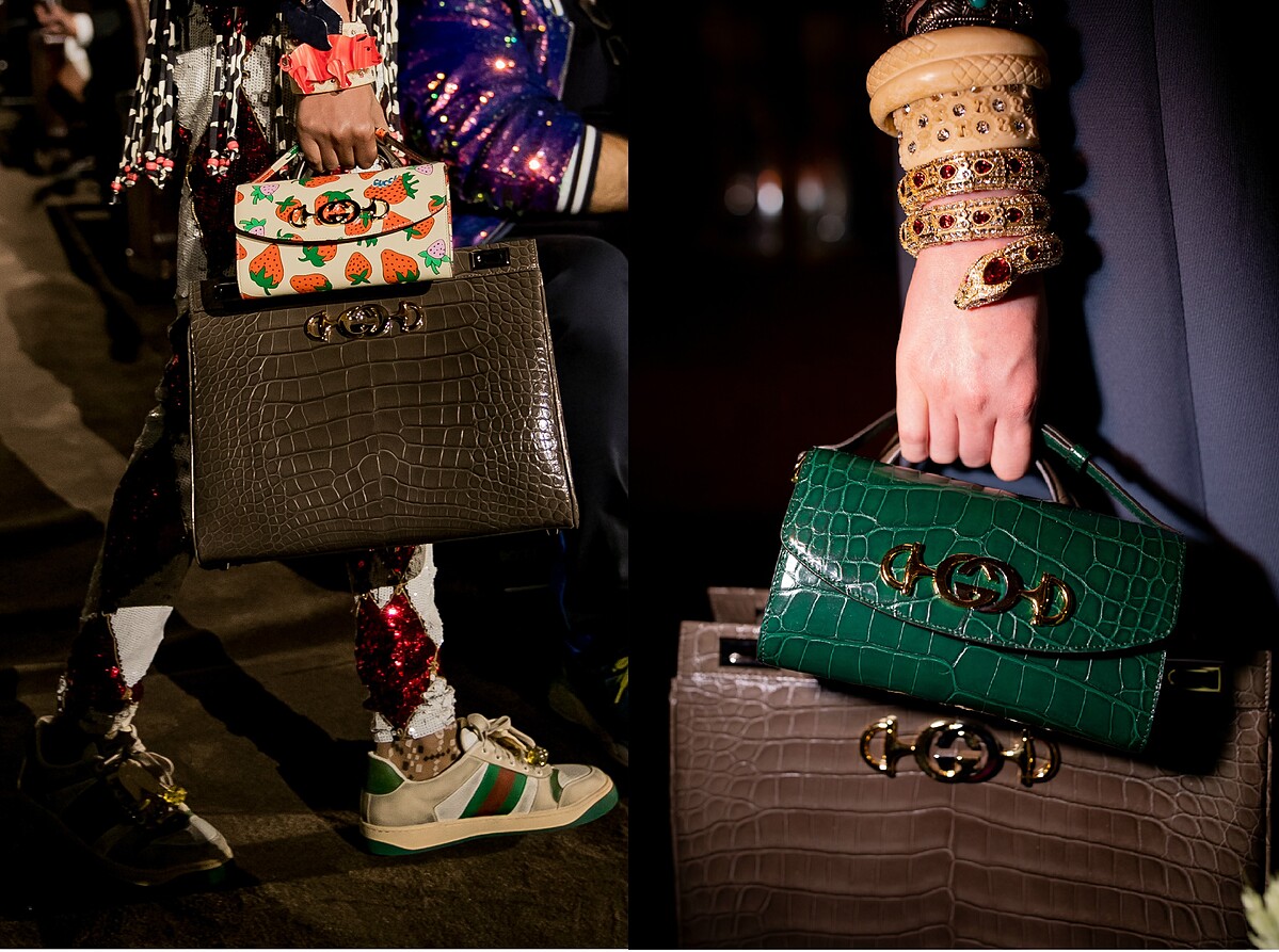 在材質與用色上,有飽和色調的亮面皮革或是荔枝紋牛皮、蟒蛇皮、鴕鳥皮及鱷魚皮等珍稀材質,也有很對年輕世代胃口的普普藝術風格的草莓圖案印花,精緻優雅或衝突搶眼,透過不同的創意視角形塑出當代時尚美學。