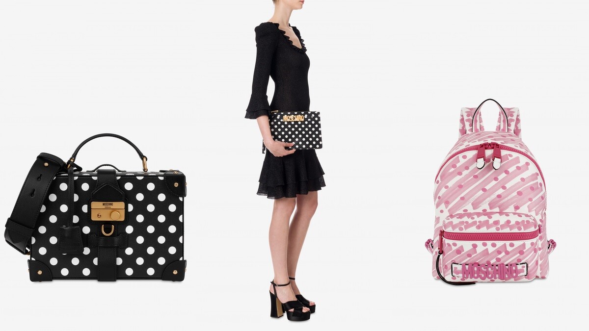 以波卡圓點為設計概念的還有MOSCHINO,像是小箱包、腰包、後背包、手拿包都推出復古點點系列,有黑色、紅色的選擇。另外,還有塗鴉風格的波卡圓點系列,包含粉紫色後背包、桃紅色塗鴉風手袋等。
