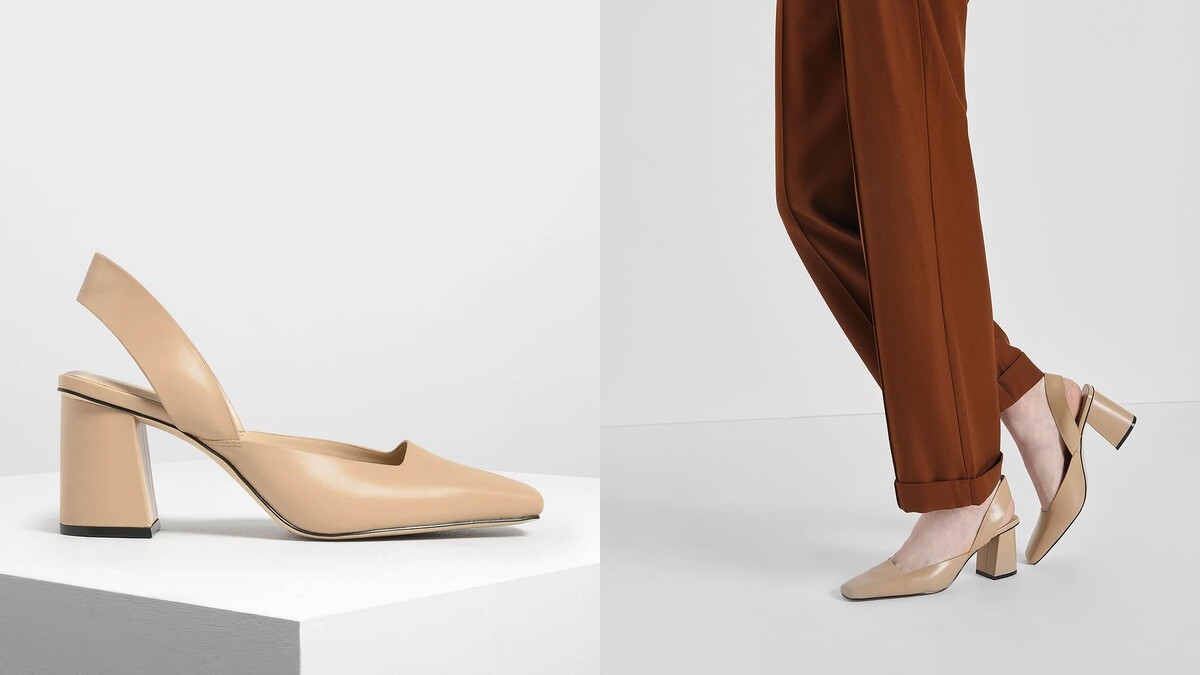 Charles & Keith,奶茶色方頭粗跟鞋,NT1,690