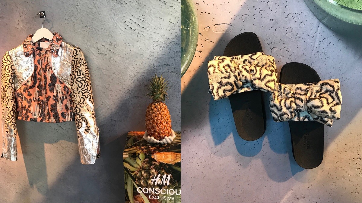 全系列中主打款式之一的銀色外套正是採用鳳梨葉所做成的纖維皮革,並加入大量印花圖案、鉚釘銀飾打造而成,另外這雙印花蝴蝶結拖鞋,其鞋底是由藻類生物製成的植物彈性泡棉。