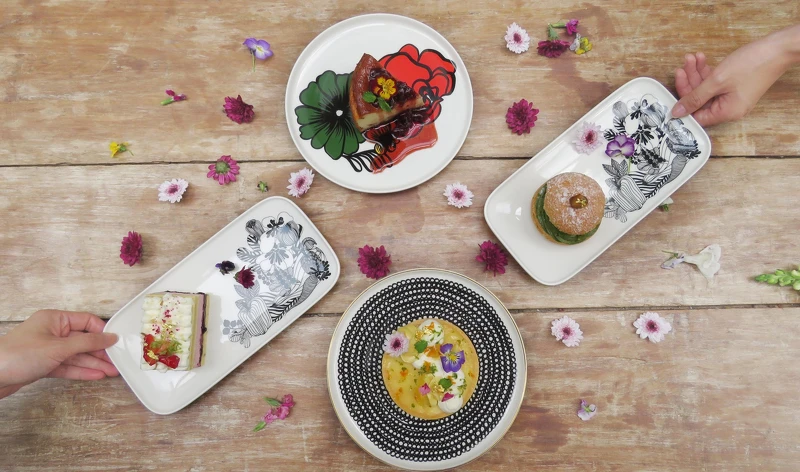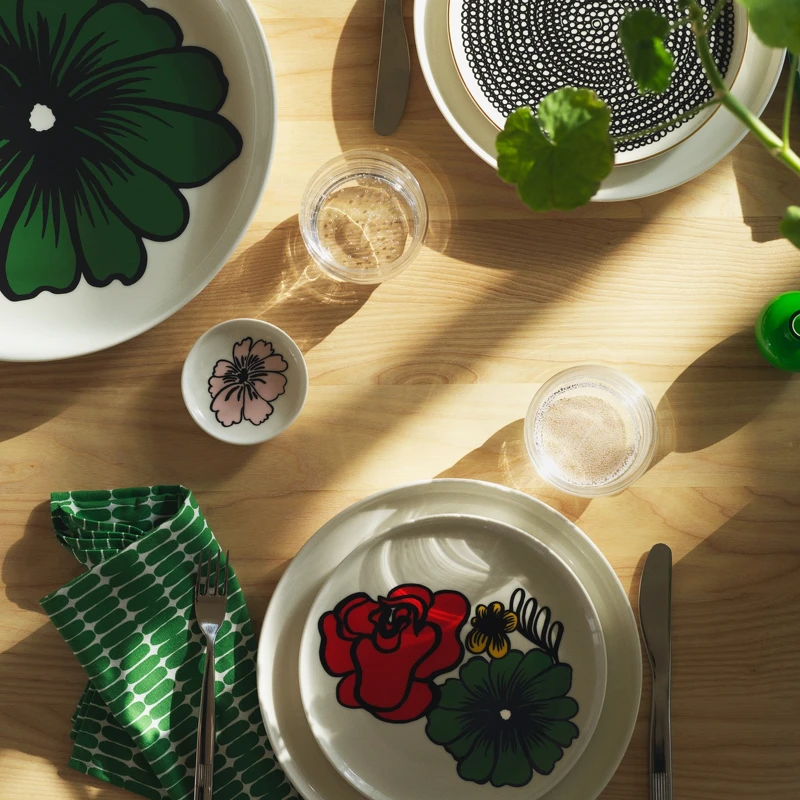 先來介紹一下這次靈感主角Oiva餐具系列,它誕生於2009年,是由設計師Sami Ruotsalainen所設計,之後另一位設計師Maija Louekari被賦予設計可以搭配此餐具系列之印花的使命,於是Siirtolapuutarha (城市花園 city garden)以及Räsymatto(地毯rag rug)這兩個筆觸鮮明、用色大膽的印花由此而生,Oiva餐具系列也成為經典之一,為許多人的餐桌增添生氣。