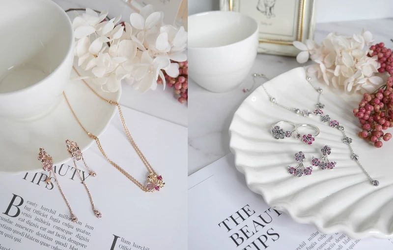 不僅是將桃花以粉色琺瑯漸層暈染在墜飾上,就連品牌經典的串飾,也成了一朵朵嬌豔桃花,更在串飾側邊以鏤空打造花朵形狀,細膩工藝讓人愛不釋手~亦或是搭配清新銀色材質,讓盛開的桃花多了分早晨染上朝露般的清新。