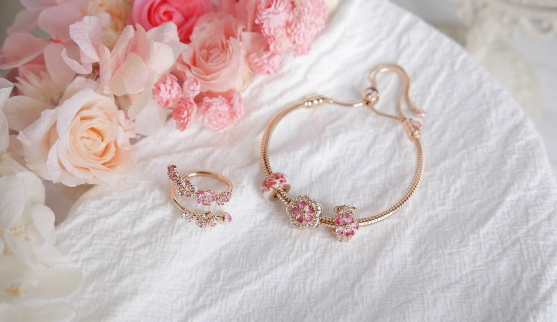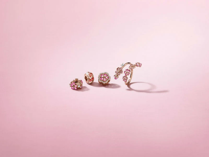 PANDORA針對台灣及中、港、澳地區推出限定的「漫漫桃花系列」,同時包含東方招來好桃花、好人際的粉色元素,與細緻優雅、適合日常配戴的設計,以漸層工藝將粉色琺瑯手繪暈染成一朵朵,在腕間、耳邊與指尖含苞待放抑或盛開的桃花,搭配Pandora Rose玫瑰金色材質,讓一切更顯浪漫。
