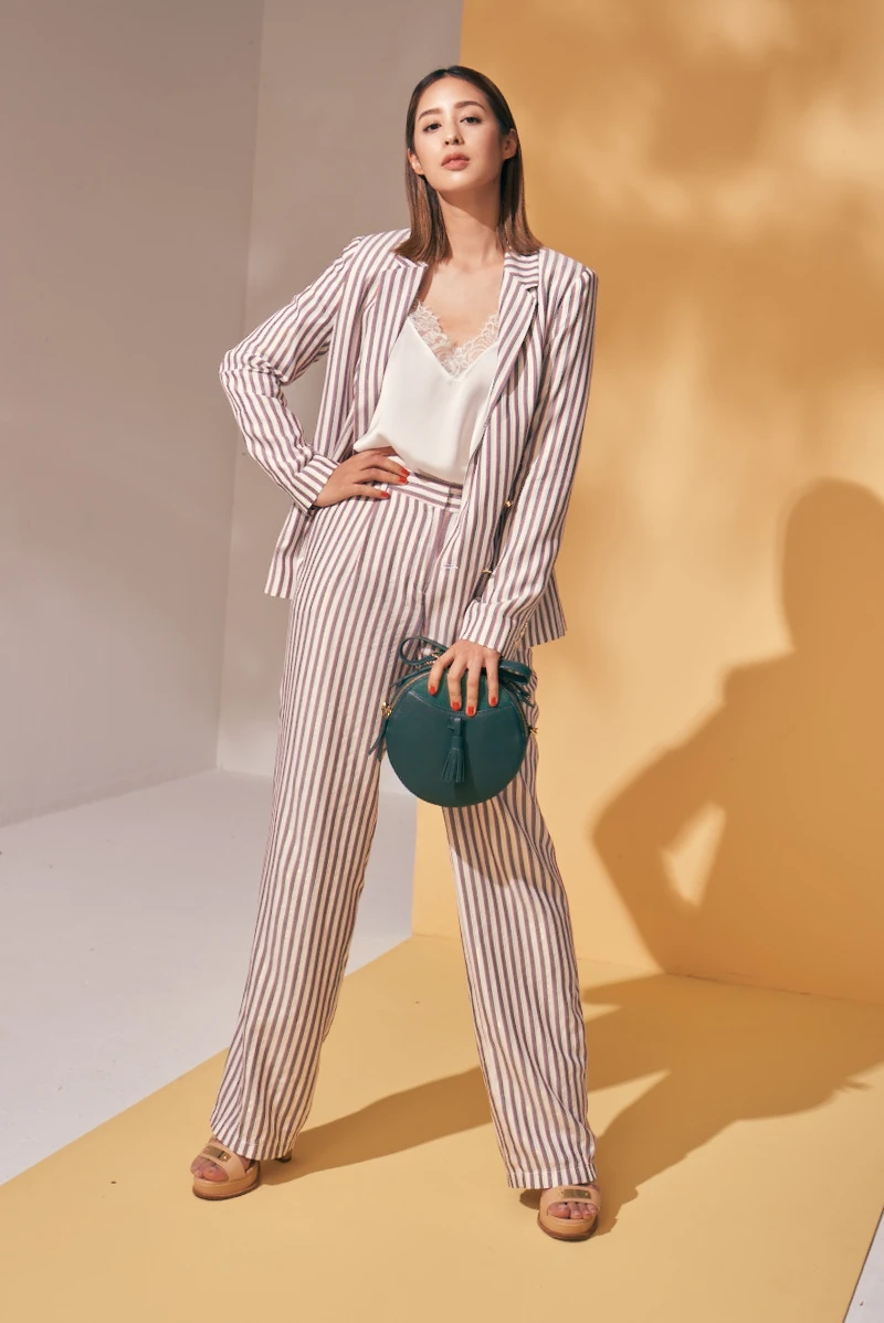 條紋金屬雙排釦西裝外套NT$8,880、條紋寬版褲NT$5,680、蕾絲細肩帶背心NT$4,080,all by KOOKAI。