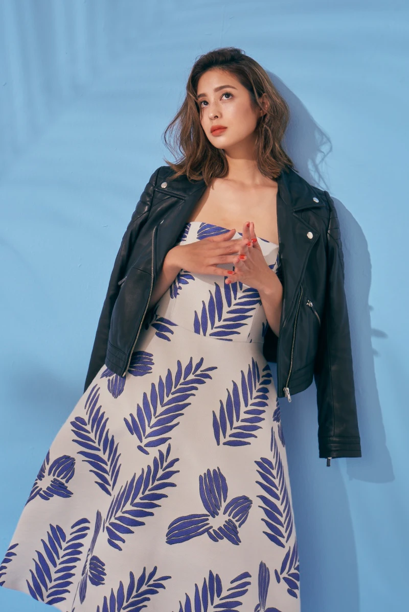 度假氛圍滿滿的色調與圖騰,最能表達出春夏氣息,像是:藍天白雲、海島、植物花卉…這些洋溢熱情活力的元素,都是莫允雯在春夏會入手的定番單品,像身上這件棕梠葉圖騰的藍白緹織洋裝就很讓她愛不釋手,散發出濃濃的懷舊復古味的女伶風情,單穿是名媛度假的上乘氣質、搭配小羊皮外套又能變化成個性女孩模樣,輕鬆就能讓夏日造型上擁有更多搭配性。