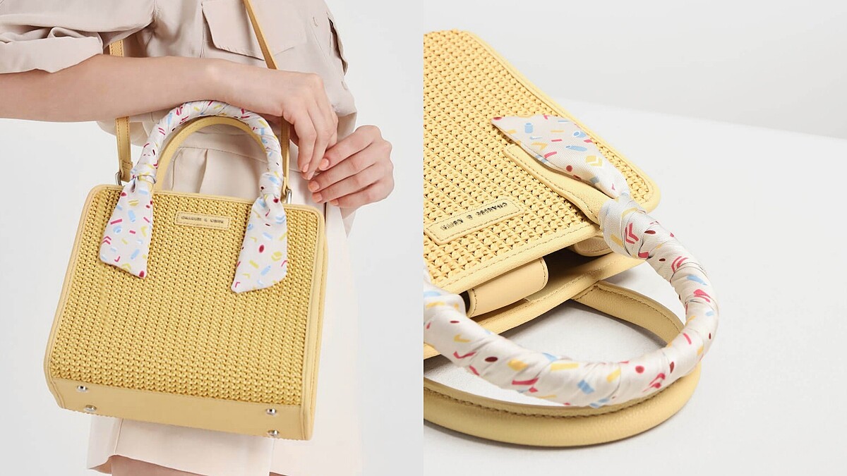 暖暖的鵝黃色絕對是今年春夏必購入的顏色選之一!這顆編織拼接皮革面的手提肩背包,在包款正前方的手提處還特地圍裹上緞面印花絲巾,紅、藍、黃的點綴,使得包包獲得俏麗的可愛氣息。然而立體的包身設計也使得東西的整放更加明瞭。(售價NT2,490)