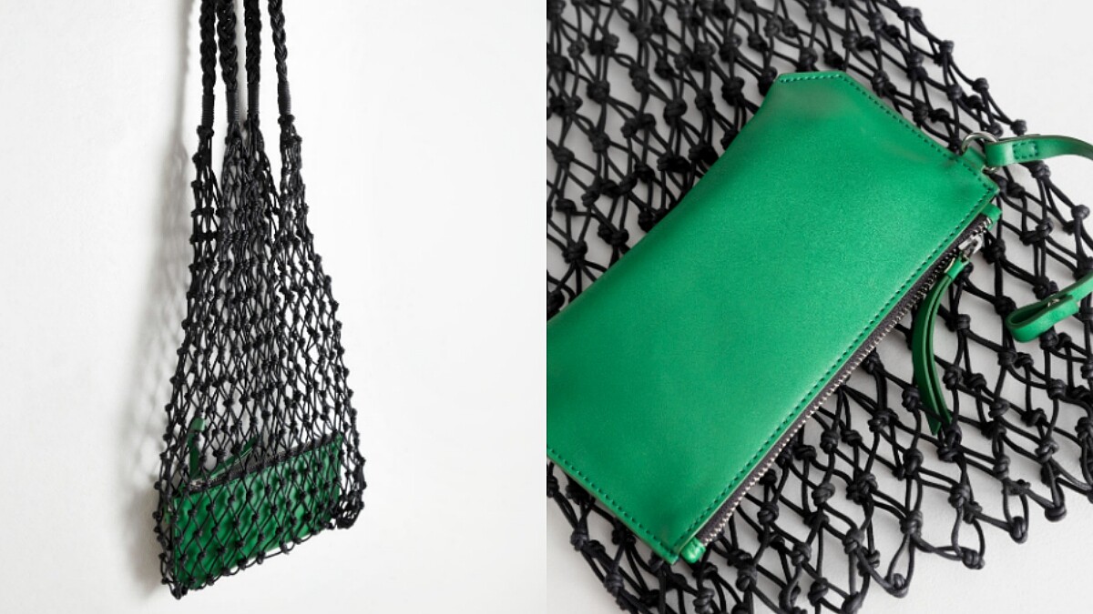 又或者可以考慮這款好似漁網的編織肩揹帶,黑色的格網裡透出綠色拉鍊手拿包,散發著有點慵懶又有點率性的風格氣息。當然也可以自己換上不同樣式的手拿包,如白色鱷魚皮革增添優呀質感,抑或尼龍款的共組運動風…展現自身玩味態度!(售價約NT1,825)