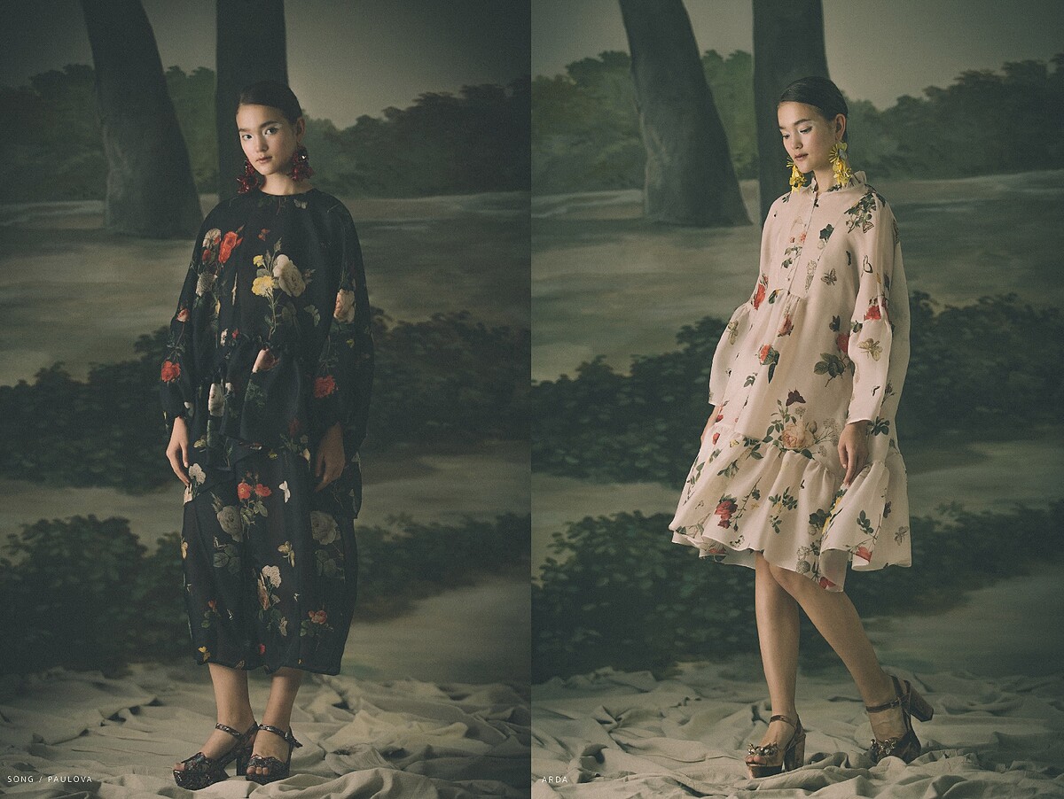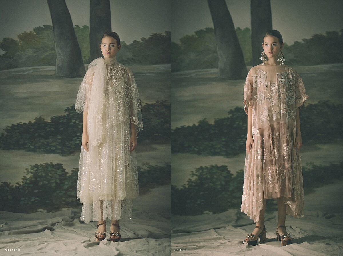 印尼設計師Biyan Wanaatmadja遊歷全世界的博物館,沉醉於館內畫作、雕塑作品以及錦繡掛毯,色彩上借鑿19世紀俄羅斯畫家Ivan Kuzmich Makarov細緻的中世紀色彩美學,融入其拿手的精緻細膩蠟染、編織和繡花工藝,延續著對於自身印尼歷史傳統文化的民族自豪誕生出這個空靈脫俗的系列。A字裙裝剪裁如行雲流水般的流暢,輕盈飄逸;珠飾亮片、立體刺繡花朵則錯落在漸層的裸色與白色雪紡紗裙上,更顯絢麗靈動,將女性與生俱來的浪漫柔情表露無遺。