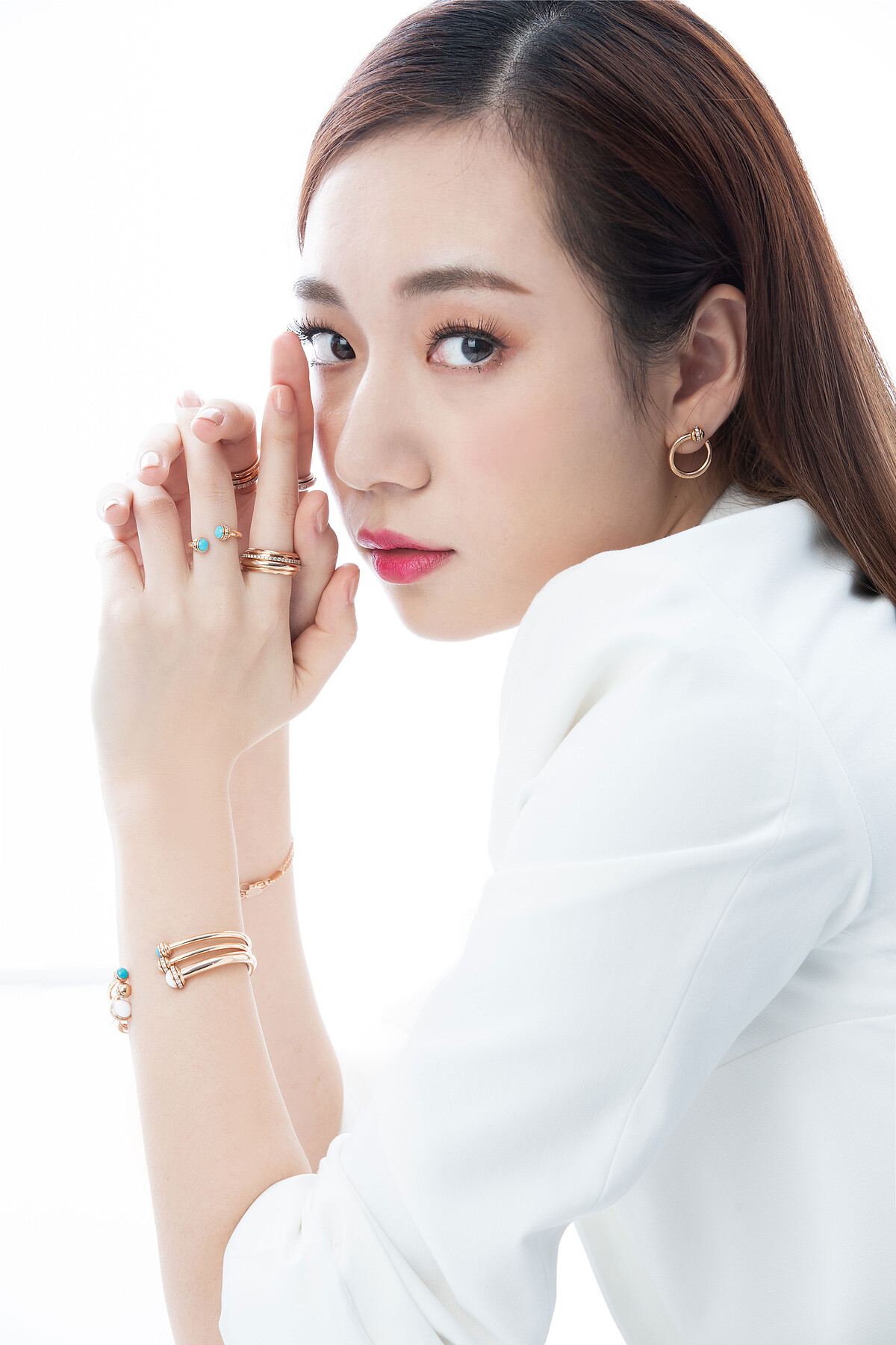 PIAGET Possession系列:全新玫瑰金鑲鑽圓形耳環、18K玫瑰金,18K玫瑰金鑲嵌美鑽墜鍊、綠松石18K玫瑰金鑲嵌美鑽墜鍊、青金石雪花式鑲鑽墜鍊;(右手) 18K白金鑲鑽戒指、18K玫瑰金鑲鑽戒指、18K玫瑰金鑲嵌單鑽及青金石幸運手鍊;(左手)綠松石18K玫瑰金鑲鑽戒指、綠松石18K玫瑰金手鐲、18K玫瑰金鑲嵌美鑽手鐲、白玉髓18K玫瑰金鑲嵌圓鑽與鑲鑽手鐲。