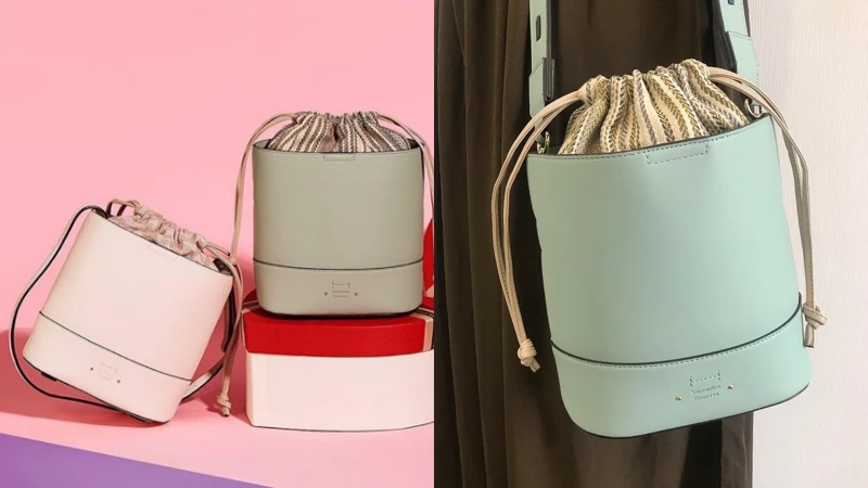 若偏愛氣質款的水桶包,則可參考這款啞光平紋的款式。色彩上不僅有著粉嫩的馬卡龍綠色,內裡搭配的民族花紋束口袋則替包深添加上了濃郁的異國氛圍,超適合外出約會時背帶!然而若是面對平日的辦公造型,也只需將束口袋拆卸,即可展現另一簡約俐落風。