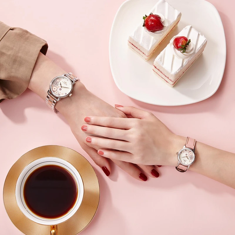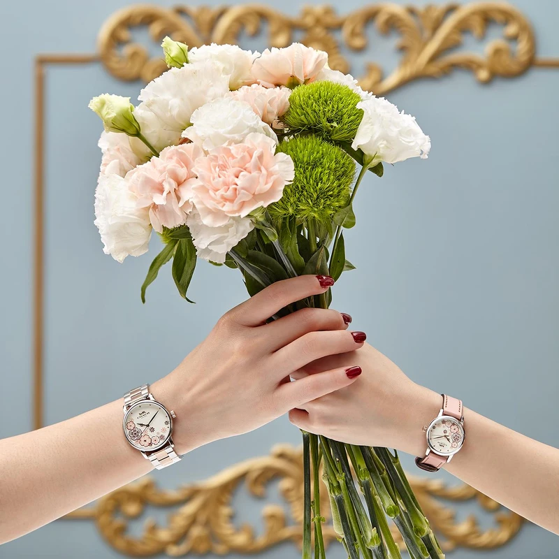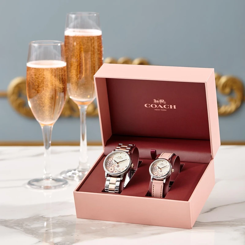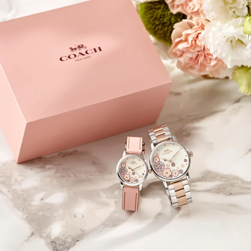 禮盒中有著兩款Coach精選的錶款,分別是36mm不銹鋼淡玫瑰金色錶殼、錶帶與28mm粉紅色皮革錶帶的兩只Grand系列腕錶,錶盤上皆有綴飾上品牌經典茶花圖案,異中求同的細膩規畫,完美展現出時髦母女的品味默契,絕對可以一起配戴收獲媽媽開心100分的幸福笑容。