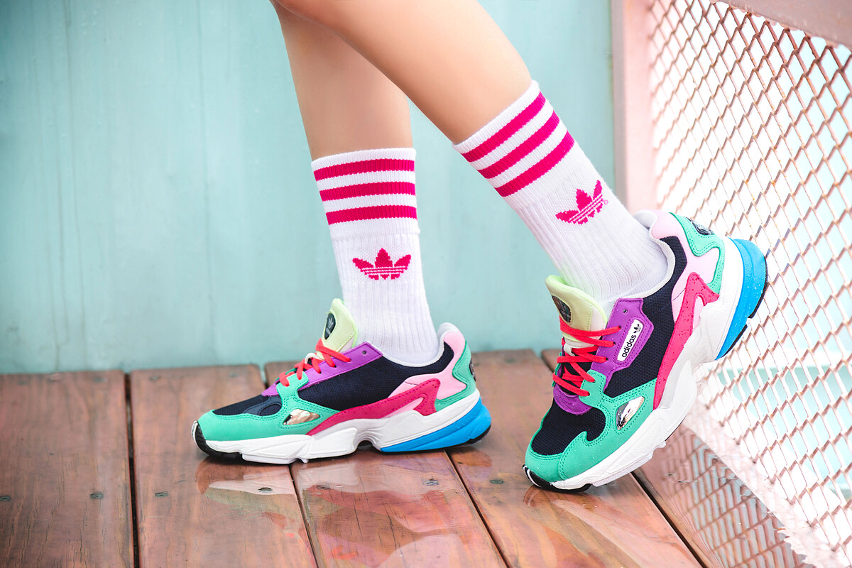 佳歡與若凡這身俏皮可愛的穿搭,最繽紛搶眼莫過於腳上的彩虹Falcon老爹鞋!Falcon鞋款的復古可愛外型、多層次拼接設計加上大膽繽紛配色,讓人一眼就愛上,是女孩們夏天穿搭一定要擁有的激推美鞋!