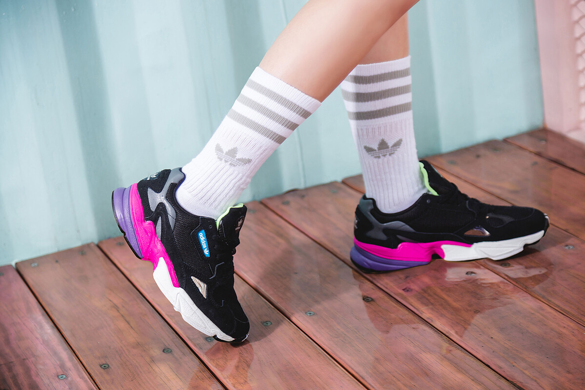 另一款黑桃配色的Falcon則是低調卻暗藏絢麗的心機代表,黑白主色調看似經典帥氣有型,卻悄悄在鞋後跟底部以桃紅紫增添少女心,瞬間擄獲女孩們的目光焦點~