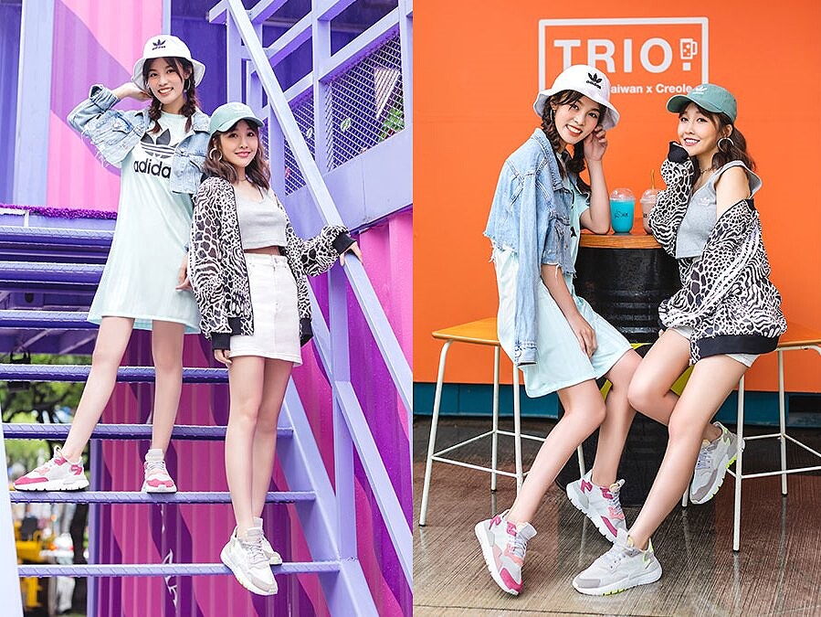 擁有滿分默契協調感的穿著,是BFF出遊穿搭最需要的造型重點!佳歡跟若凡選擇了夏天人人都會擁有的灰白色調單品來組合造型,再加入討喜薄荷綠單品來做出畫龍點睛的亮眼效果,可愛夢幻指數瞬間UP飆升!一個是可愛甜美One Piece裝、一個是個性微辣短裙風,截然不同的風格卻在同色系搭配下完美融合,就連鞋子也約好穿上同款NITE JOGGER,在飲料甜點還沒上場前,就能先狂拍個數十張美照啦!