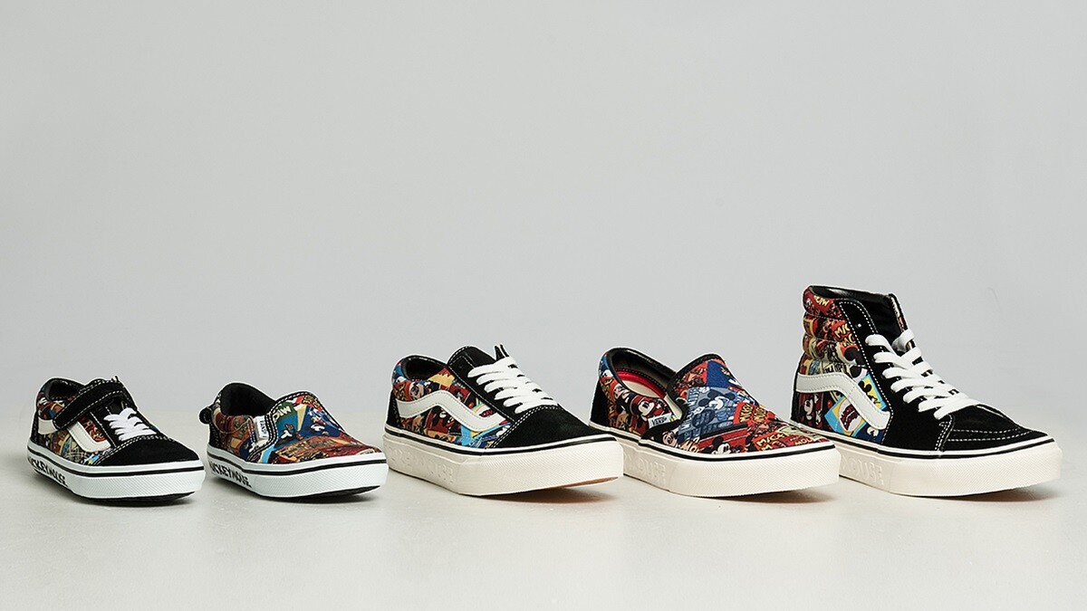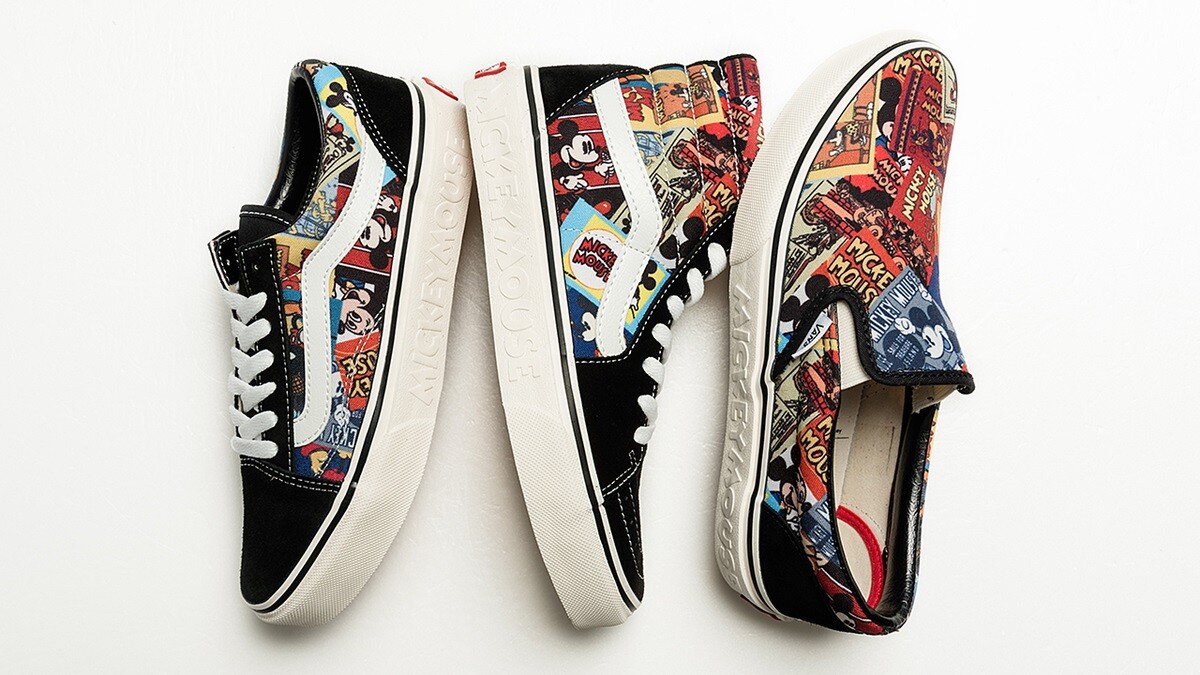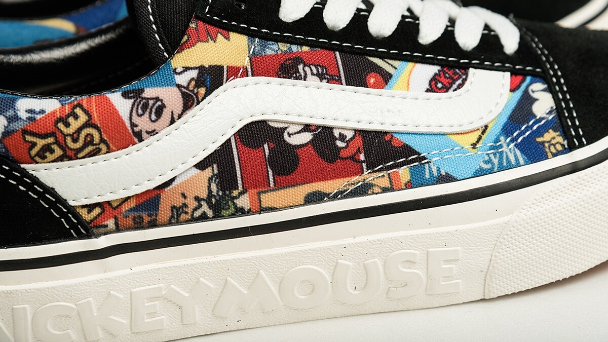 米奇聯名系列帆布鞋包含Slip-On懶人鞋、經典Old Skool及高筒的SK8-Hi鞋款。Slip-On鞋型搭載帆布材質,並以滿版米奇圖案呈現。Old Skool及SK8-Hi鞋型運用麂皮拼接帆布,並縫製上經典水波紋皮革標誌。