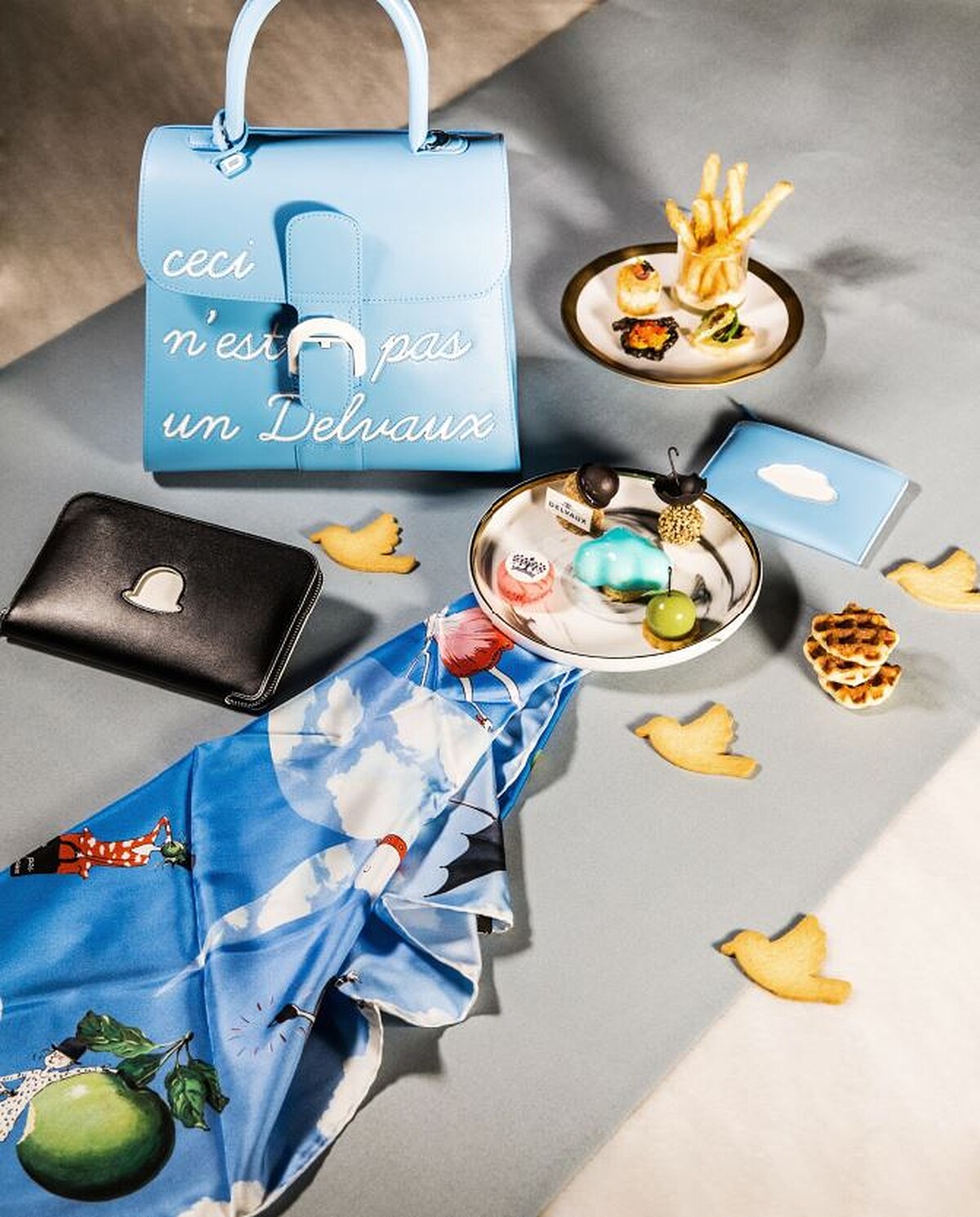 因應這次展覽登場與開賣,DELVAUX特別和中庭的BELLAVITA café推出聯名下午茶,採用傳統皇家三層架,由下而上的品項從鹹到甜,最底層是龍蝦沙拉三明治、蕃紅花淡菜墨魚脆片、比利時孢子甘藍香菇烤乳酪麵包,第二層則有傳統比利時鬆餅及鴿子餅乾,最上層則是可愛甜點,有天藍色雲朵、開心果慕斯化為綠蘋果、巧克力椰子脆片酥製成的黑色禮帽…等等,超級吸睛!DELVAUX René Margritte馬格利特系列與BELLAVITA café限定午茶午茶組將從5/16(四)-6/9(日)配合同名系列特展期間於中庭限量販售,愛拍IG美照的人可別錯過這一系列的逛展兼吃美食小行程。