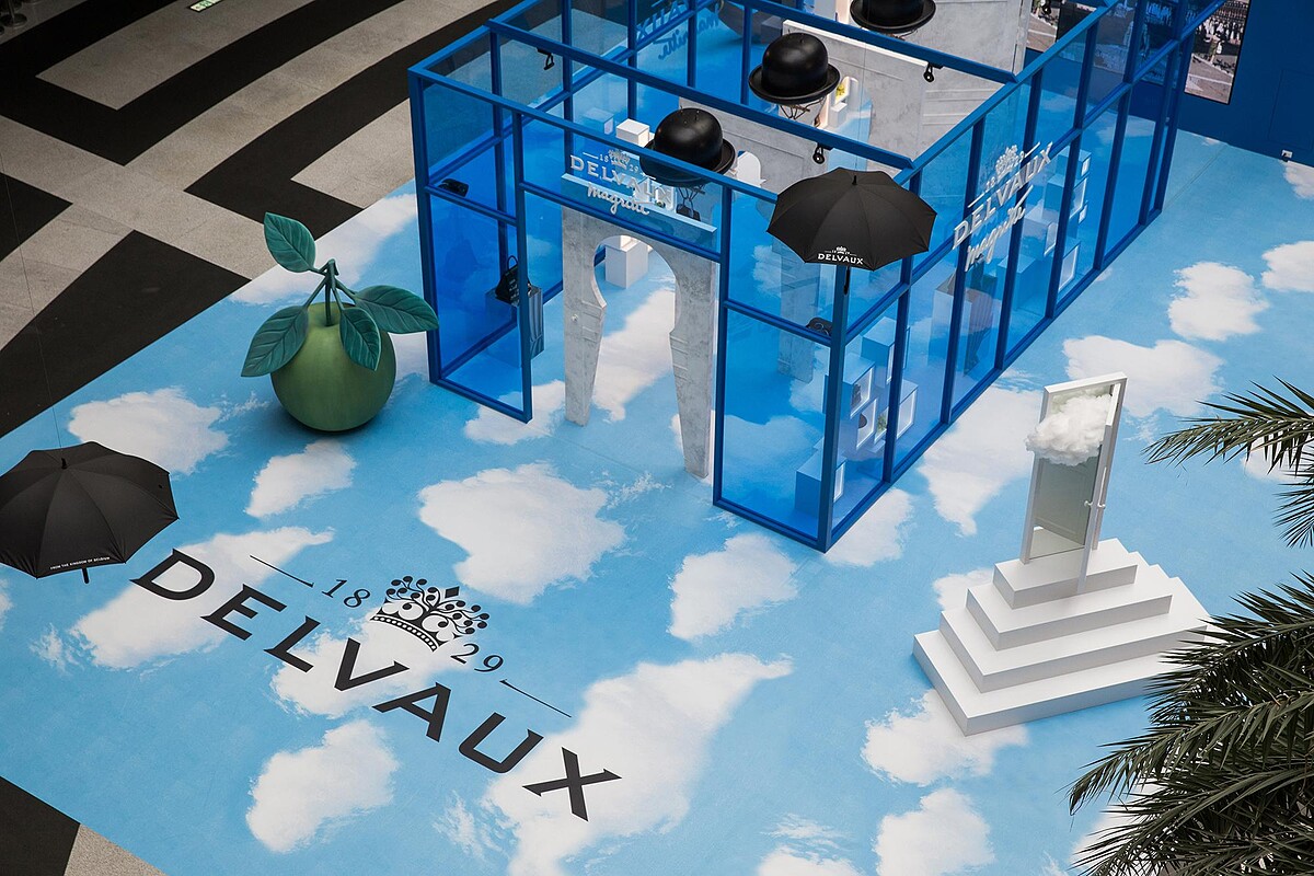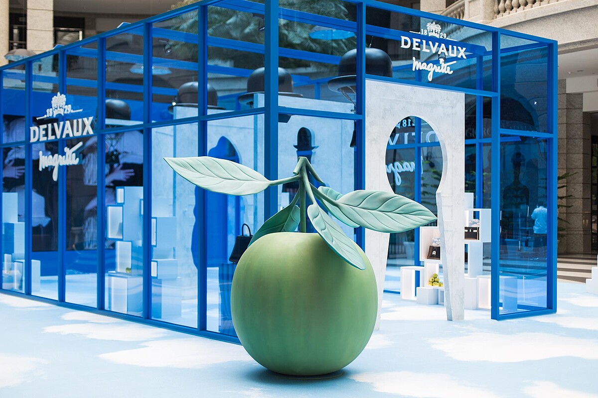 這次在Bellavita一樓期間限定登場的DELVAUX馬格利特系列展覽,延續魔幻風格,以水藍色半透明製作牆面,天空圖騰作為地板,高空懸掛著多支雨傘,有超巨大的綠蘋果、菸斗、半開門和雲朵裝置,每個角落都超適合拍IG美照。