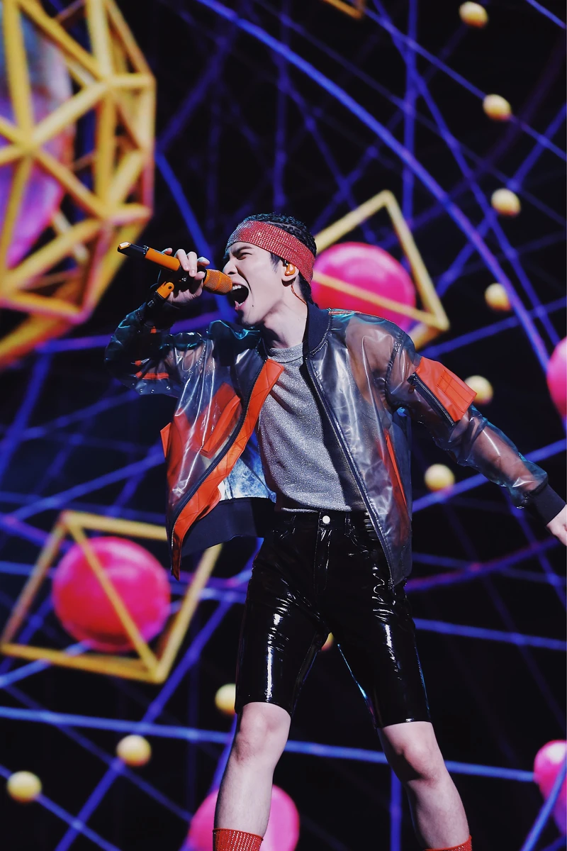 第二套同樣是紅黑配色,老蕭穿上近幾季最夯的亮面單車褲,配上透明PVC材質外套、頭帶,十足街頭風格。搭配涼鞋和長襪的老蕭,在舞台上跳動時因為覺得有點滑,竟直接在舞台上把鞋襪脫掉,率性的大男孩魅力展露無遺。