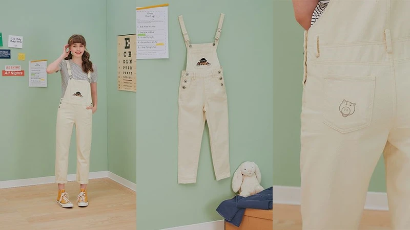 夏日必備的牛仔短褲就加入了三眼怪的刺繡圖案,三種不同表情的三眼怪在短褲上面,可愛程度絕對讓女孩無法抵擋。還有蛋頭先生圖案的斜紋吊帶長褲,結合清新風的米白色系相當適合夏季,長褲背後屁股口袋更放上超萌火腿豬刺繡。