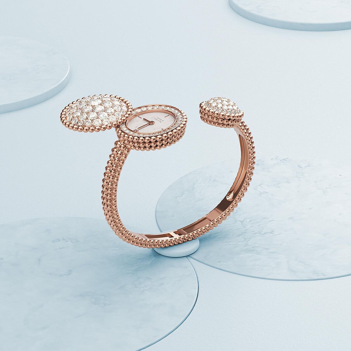三款手鐲珠寶腕錶,在開口式手鐲的兩端,飾有兩枚大小各異的圓形白色珍珠母貝錶盤或寶石裝飾圓盤。另一款玫瑰金項鍊腕錶,以滿滿金珠與鑽石打造如球體的墜飾,顯示時間的錶盤則隱身於可滑動的鑲鑽錶蓋之下。