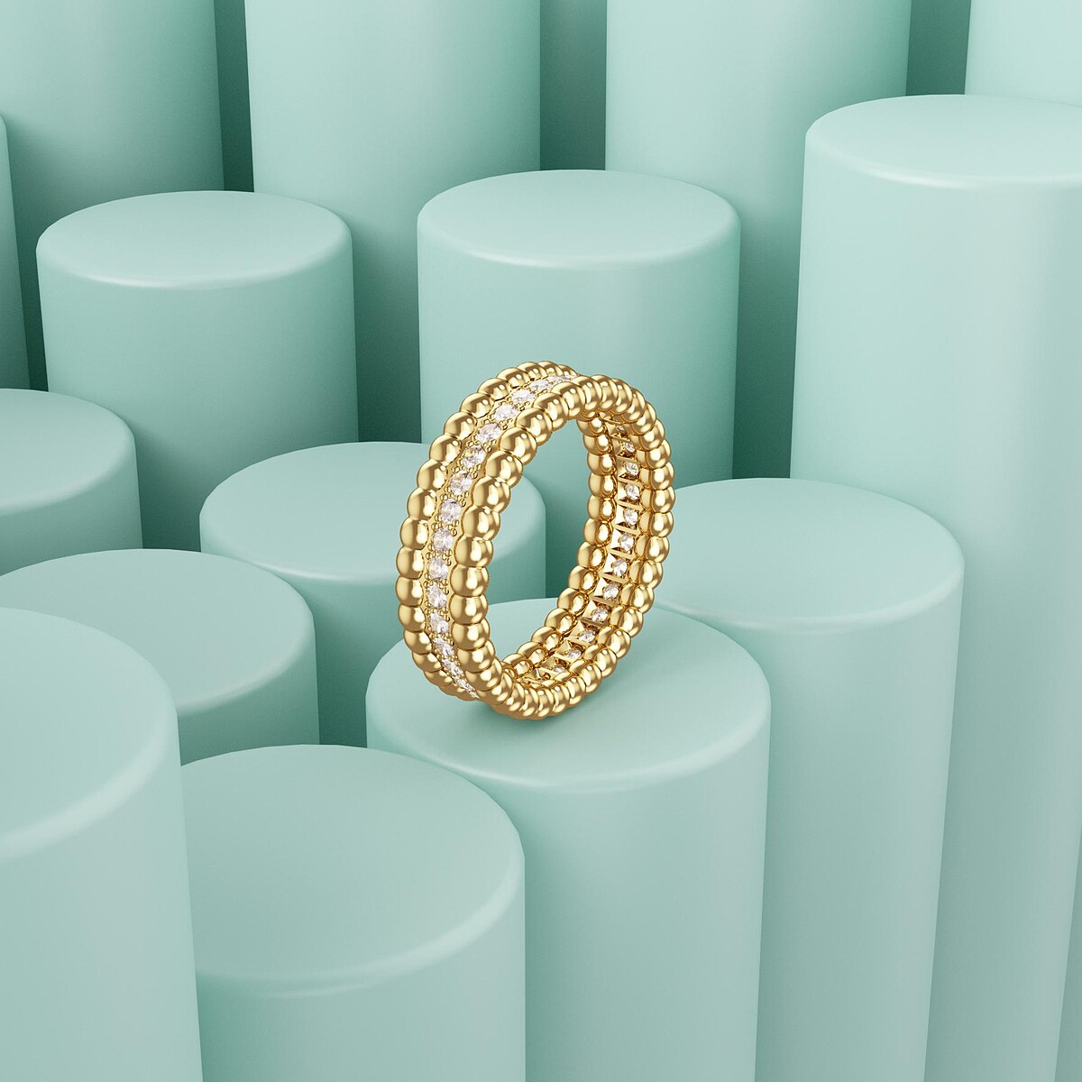 黃K金、白K金及玫瑰金戒圈中央鑲嵌一圈鑽石,上下兩列以同尺寸金珠圍繞一圈