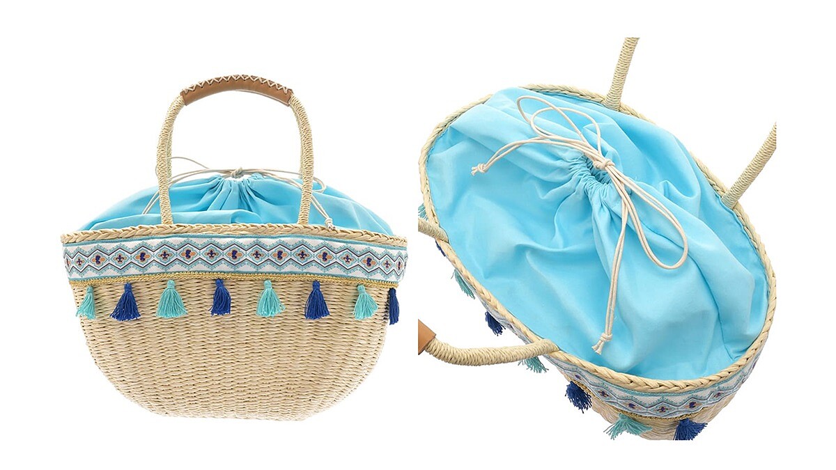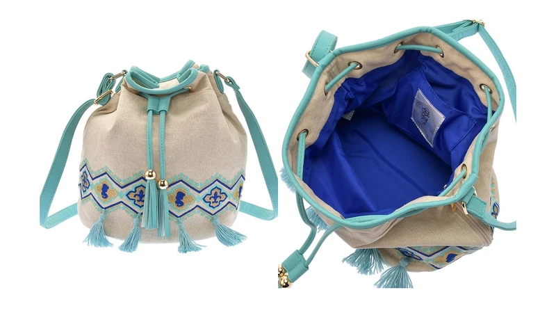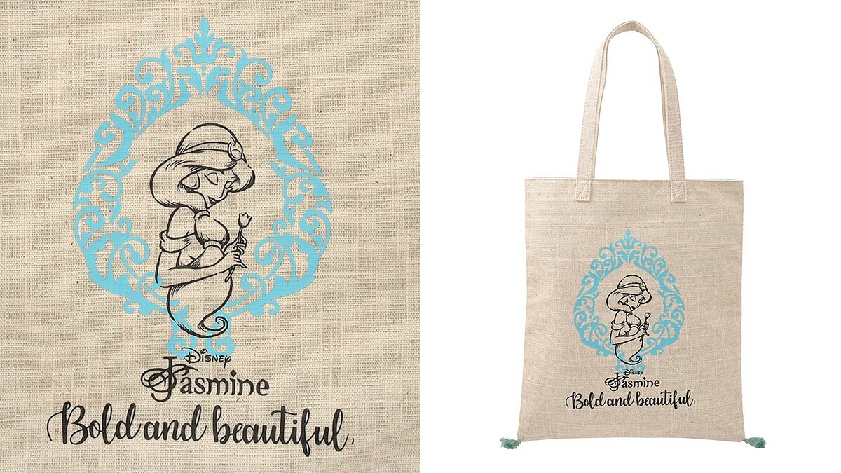 除了這幾個編織包款,還推出壓印有茉莉公主圖案的托特袋,托特袋底下的兩個角落,還加上了魔毯的流蘇裝飾,看起來是不是真的像魔毯呢。