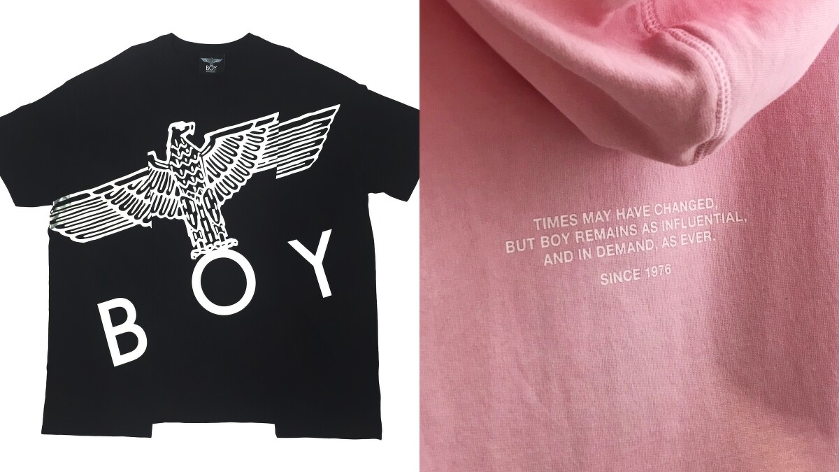 長期以來深受龐克文化洗禮的Boy London,自品牌創立自今已設計出許多和龐克元素相關的服飾,而今年則大膽跨越時空,採用1976年的龐克風,如斑駁照片和各種塗鴉手寫字體等,甚至將品牌標誌鷹型商標轉化為羽毛蛻去後的重生,巧妙敘述著龐克精神於2019年重獲新生的概念。