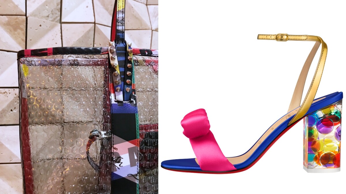 一向喜愛將旅遊時看見的美好新鮮事物融入作品中的Christian Louboutin先生,這回延續此設計發想,將陽光明媚的葡萄牙和覆滿白雪的喜馬拉雅草原設為創作衍生,打造出一雙雙充滿故事性的精美鞋履。像是充滿度假氣息的藤編加上Christian Louboutin旅行中拍攝的獨家回憶,均巧妙的結合成了活潑感滿載的鞋履,上頭甚至能看見Christian Louboutin先生本人的可愛照片喔。抑或是樂園中的繽紛氣球們,在經過Christian Louboutin先生的設計後,成了鞋跟上的夢幻裝點,尤其在燈光的照耀下更顯動人!然而喜愛旅遊的Christian Louboutin先生也特地將打包時時常用上的泡泡紙做為包身的設計發想,研發出猶如真的泡泡紙的透明材質,既獨特又新鮮!