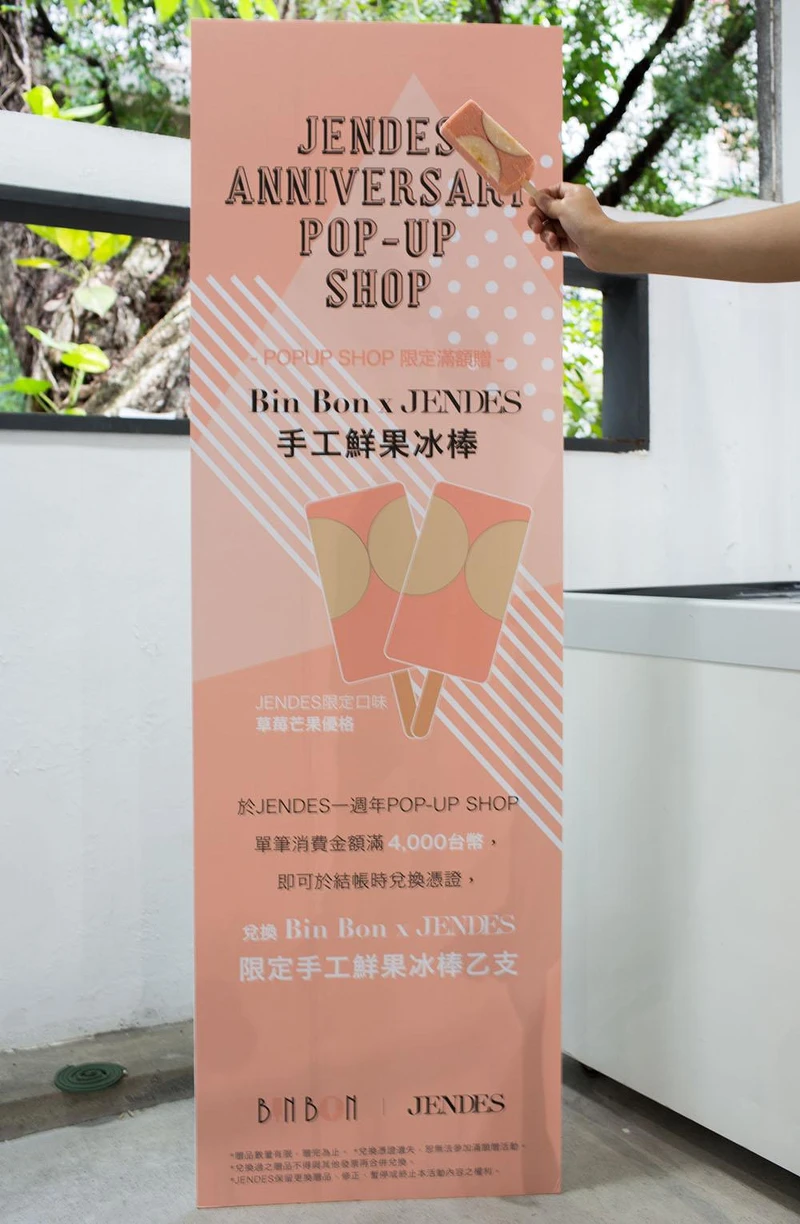 實體快閃店同步推出單筆消費滿4000元,就能獲得「Bin Bon x JENDES 聯名限定手工鮮果冰棒」,除了好逛又好拍,連好吃的部分都兼顧了。