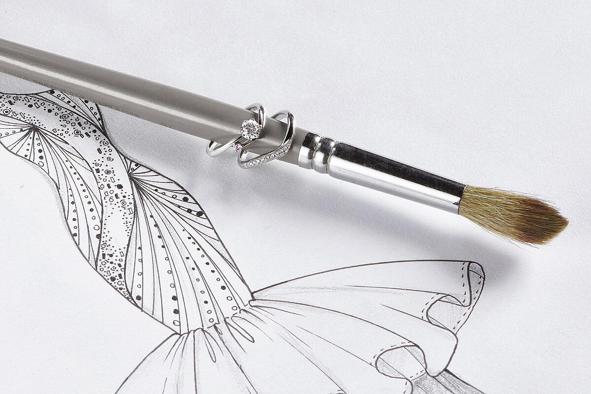 以I-PRIMO「SPICA」婚戒作為靈感,特別用鑲綴的粉色小鑽,變化出多重敘事的設計結構,演繹滿滿的「祝福」氛圍,設計師蘇蘭若用「宛若星河」的面貌,詮釋出女性命題的優雅以及深刻意涵。看似繁複的作品形狀,在蘇蘭若縝密的安排下,呈現出讓人驚喜的面貌。