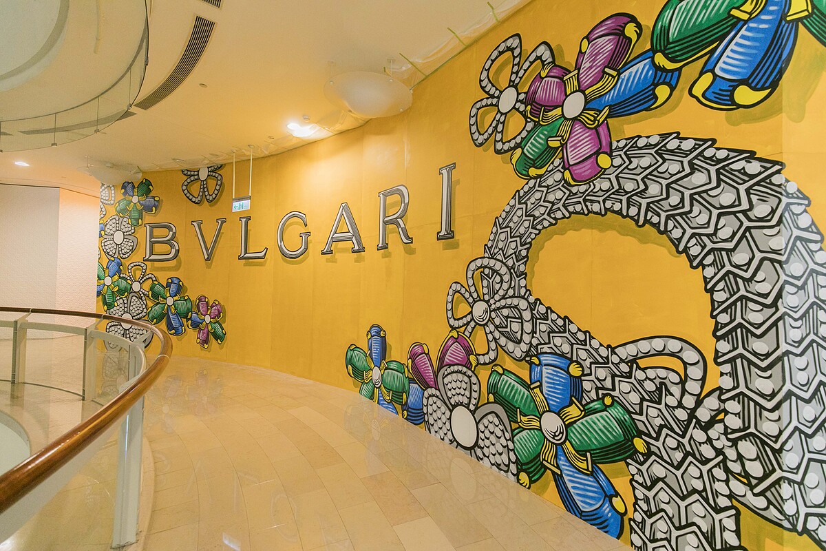 在台北街頭也能看到羅馬藝術!BVLGARI為了全新形象概念店,特地邀請義大利當代潮流藝術家Lucamaleonte來台,以品牌最經典的Serpenti 、Fiorever八辦花以及Mediterranean Eden 彩寶花朵等符號,透過大膽且細膩的筆觸風格,為概念店打造嶄新面貌。