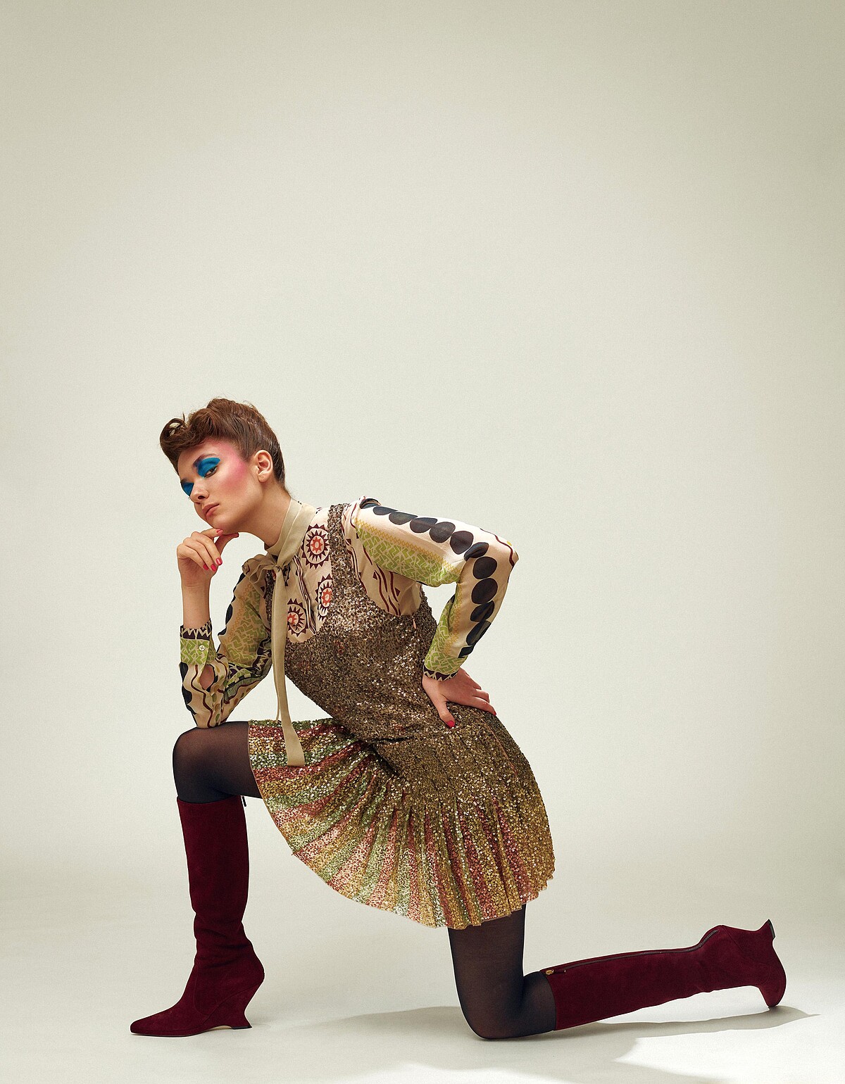 絲質印花襯衫、亮片洋裝、酒紅色麂皮長靴,all by Dior