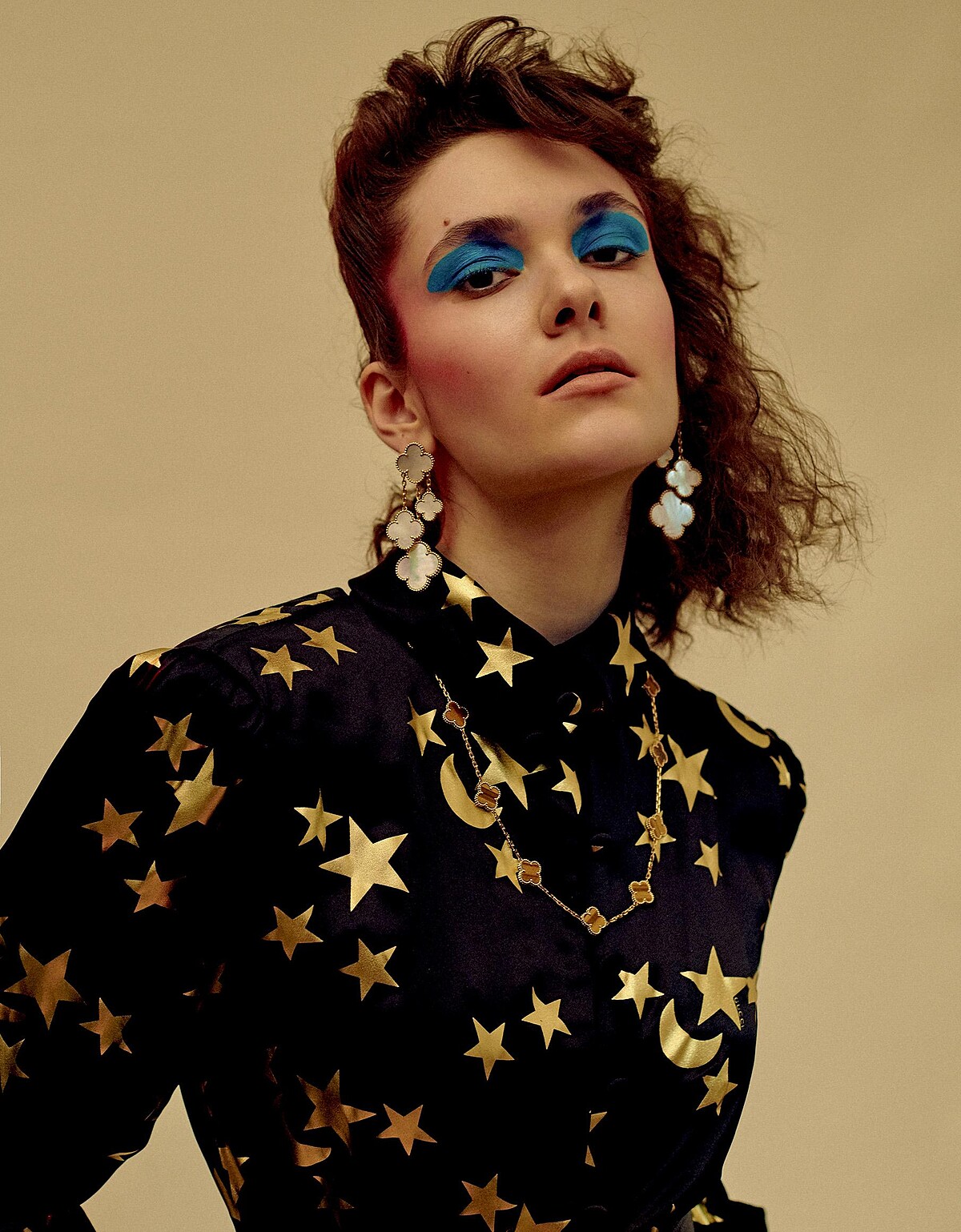 圖騰緞面襯衫,Gucci;Magic Alhambra 黃K金鑲嵌珍珠母貝項耳環、Vintage Alhambra 黃K金項鍊、黃K金鑲嵌虎眼石項鍊與手鍊(兩件連接用作長項鍊),all by Van Cleef & Arpels。
