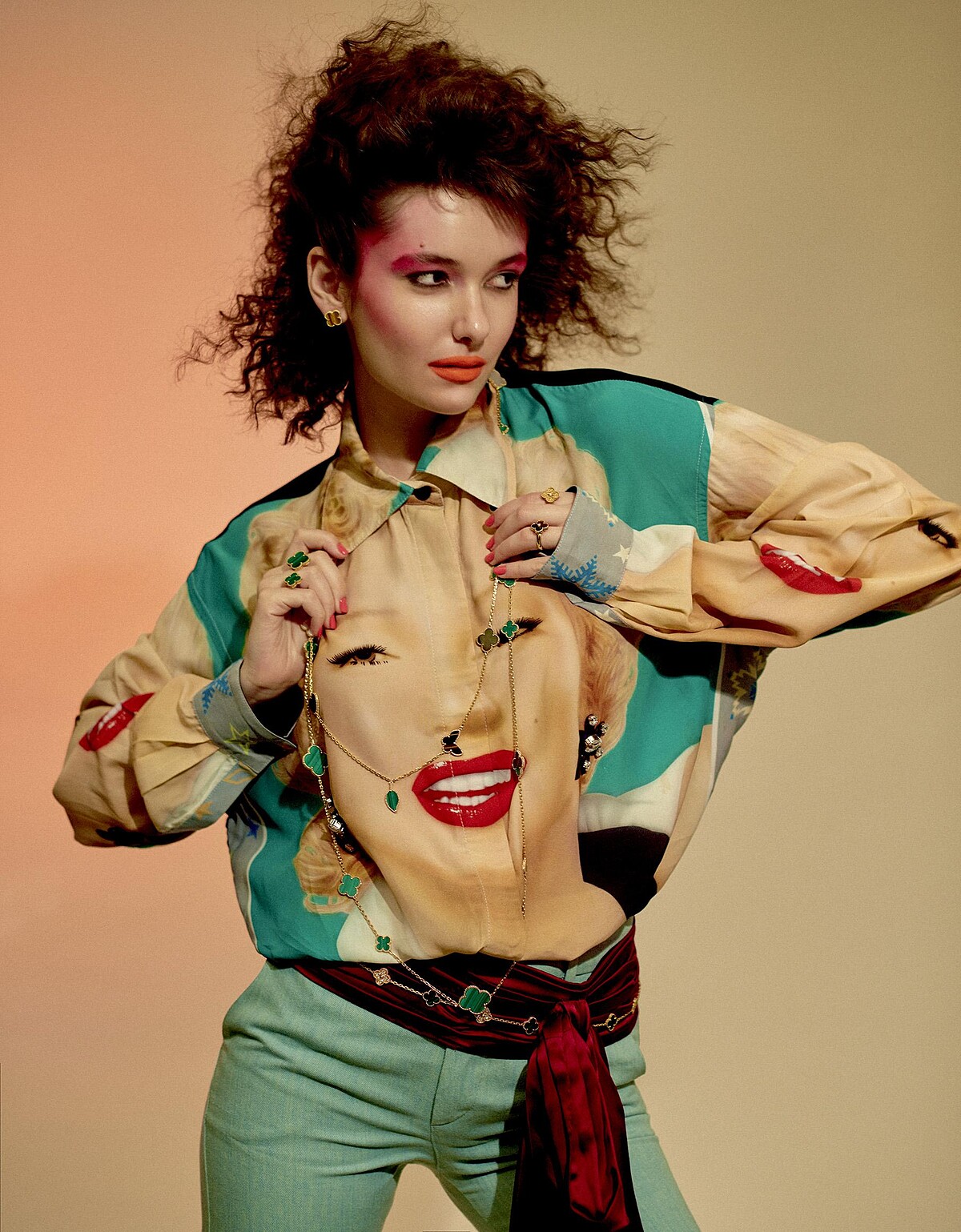 寬版彩色圖案襯衫,Loewe;丹寧褲、腰帶,both by Gucci;Vintage Alhambra 黃K金鑲嵌虎眼石耳環、黃K金鑲嵌虎眼石與鑽石戒指、黃K金鑲嵌鑽石戒指、Magic Alhambra 黃K金鑲嵌孔雀石與鑽石指間戒、黃K金鑲嵌孔雀石與鑽石項鍊(用作腰帶)、Lucky Alhambra 黃K金鑲嵌珍珠母貝、孔雀石、虎眼石與紅玉髓長項鍊、Magic Alhambra 黃K金鑲嵌孔雀石長項鍊,all by Van Cleef & Arpels。