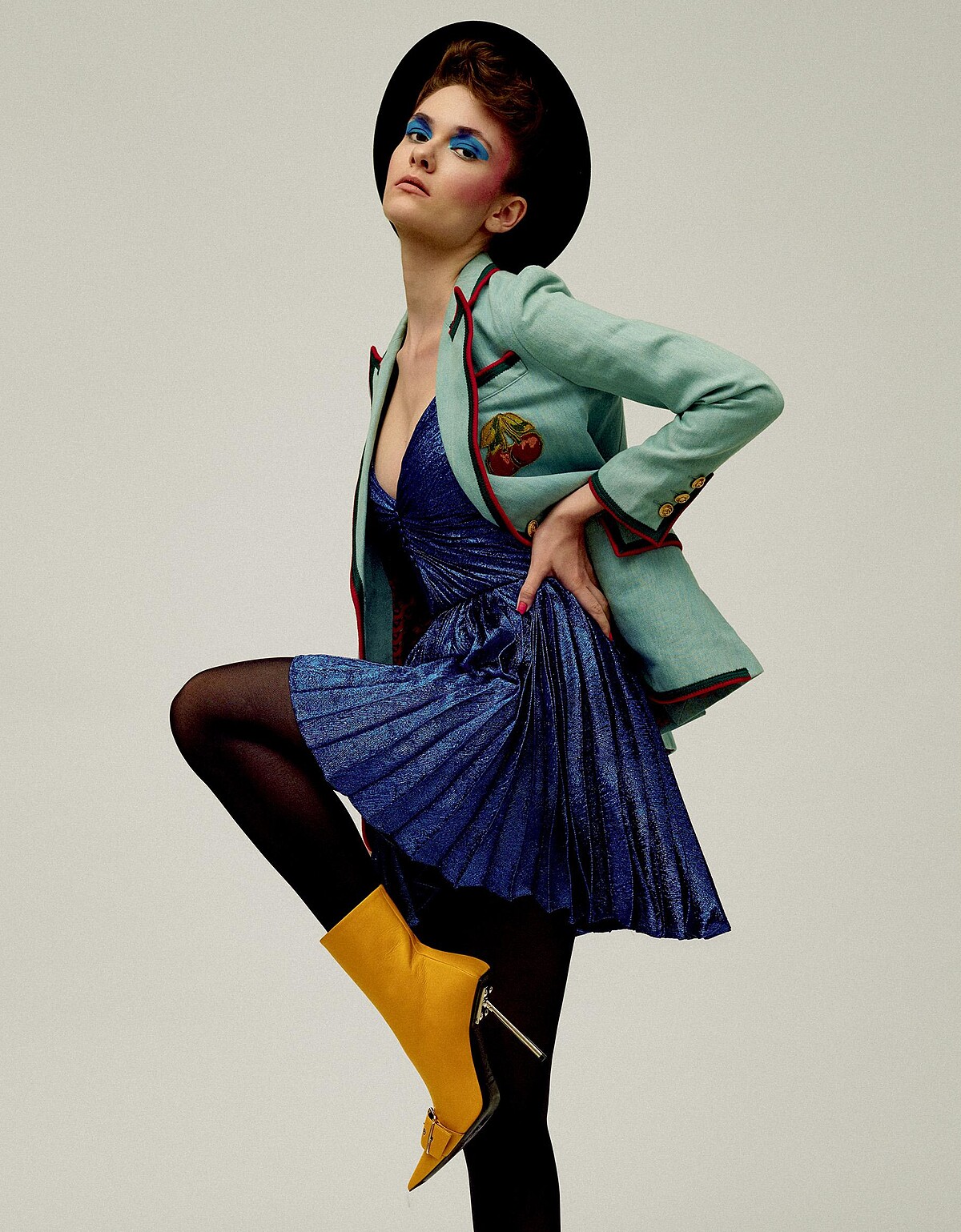 金蔥細肩帶洋裝、紳士帽,both by Saint Laurent;丹寧西裝外套,Gucci;黃色細跟短靴,Balenciaga。