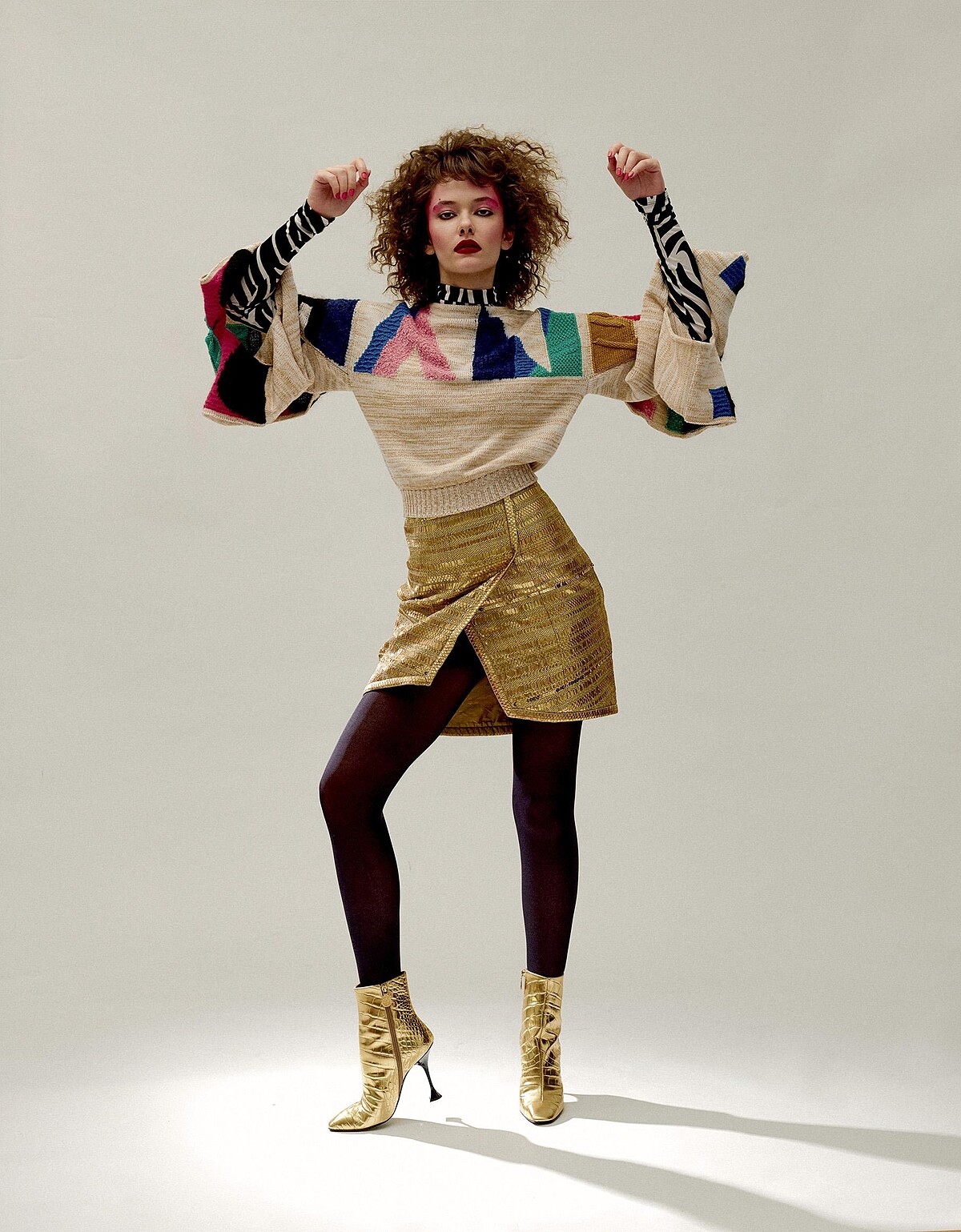圖騰針織上衣、金色窄裙、金色短靴,all by Chanel;斑馬紋連身衣,Versace。