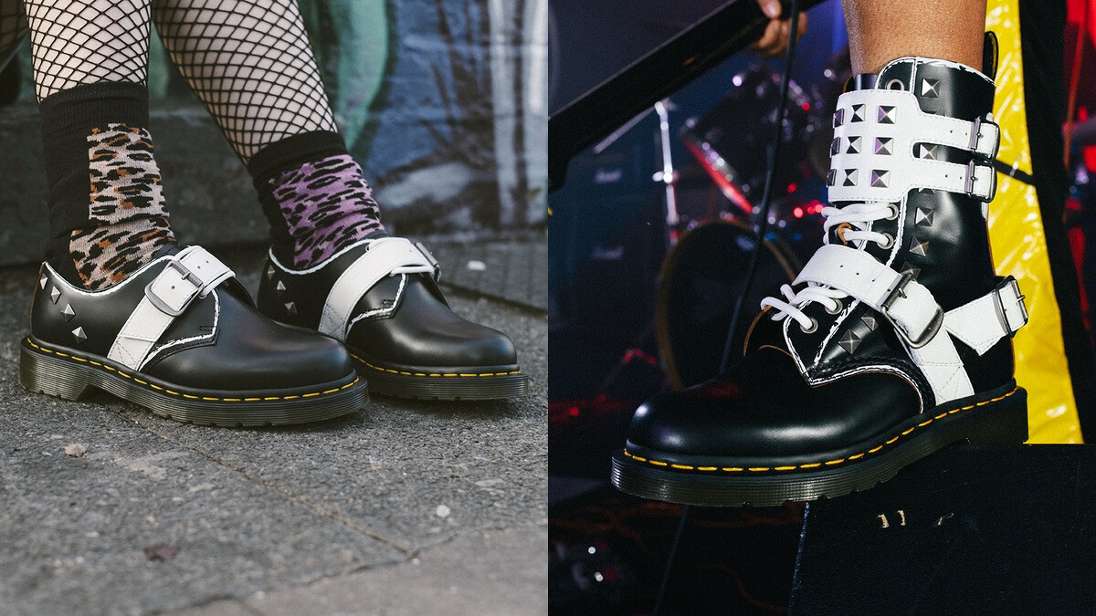 STUD PACK系列正是2019年秋冬新品,延續另類、音樂與創新的品牌元素,融入誇張的繫帶、金屬扣和方型金字塔尖飾釘,更以粗曠的白色手繪風格圍繞鞋緣,突顯最前衛的龐克風格。(1641鞋款,NT6,880 / 1490鞋款,NT10,800 / 1460鞋款,NT7,880)