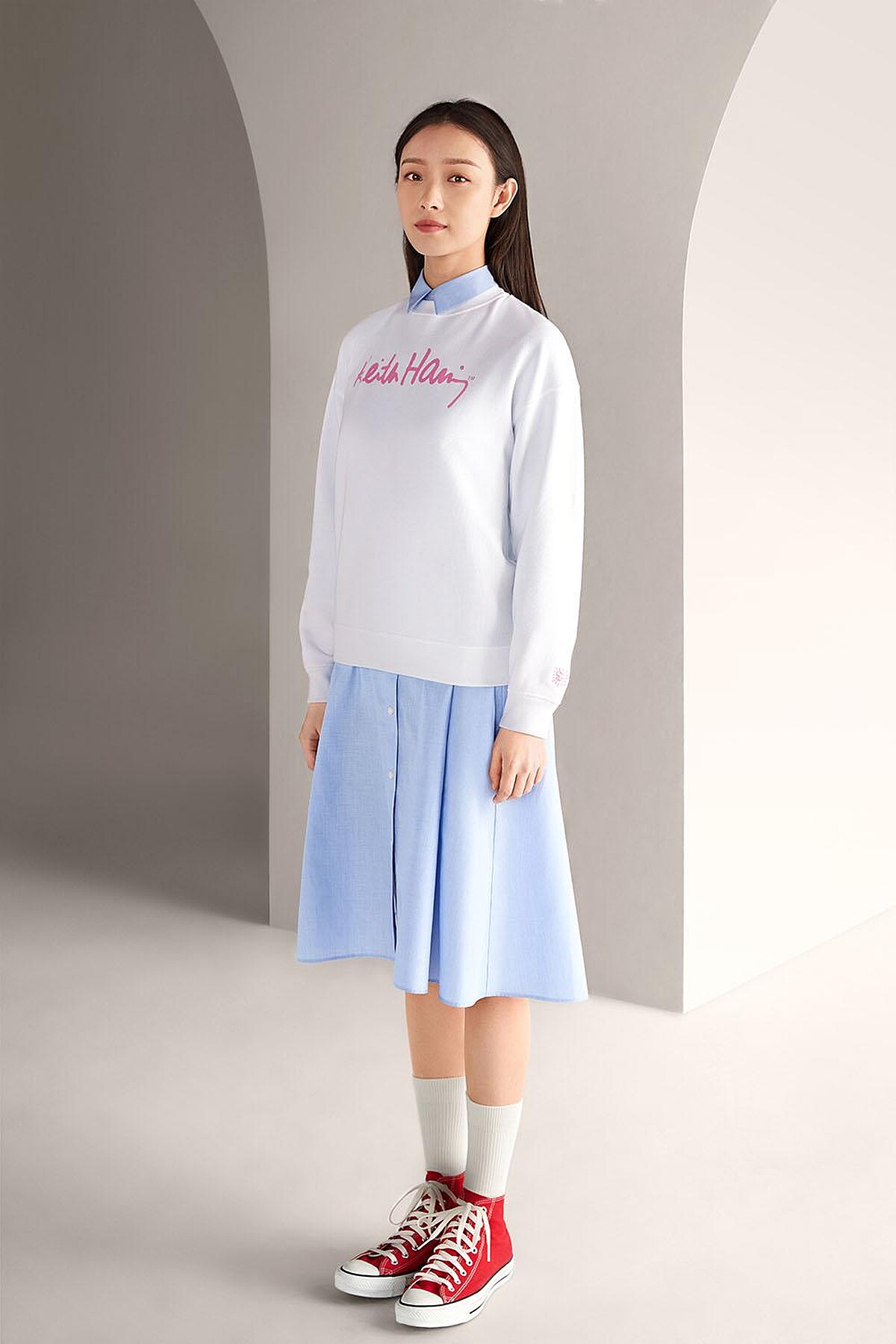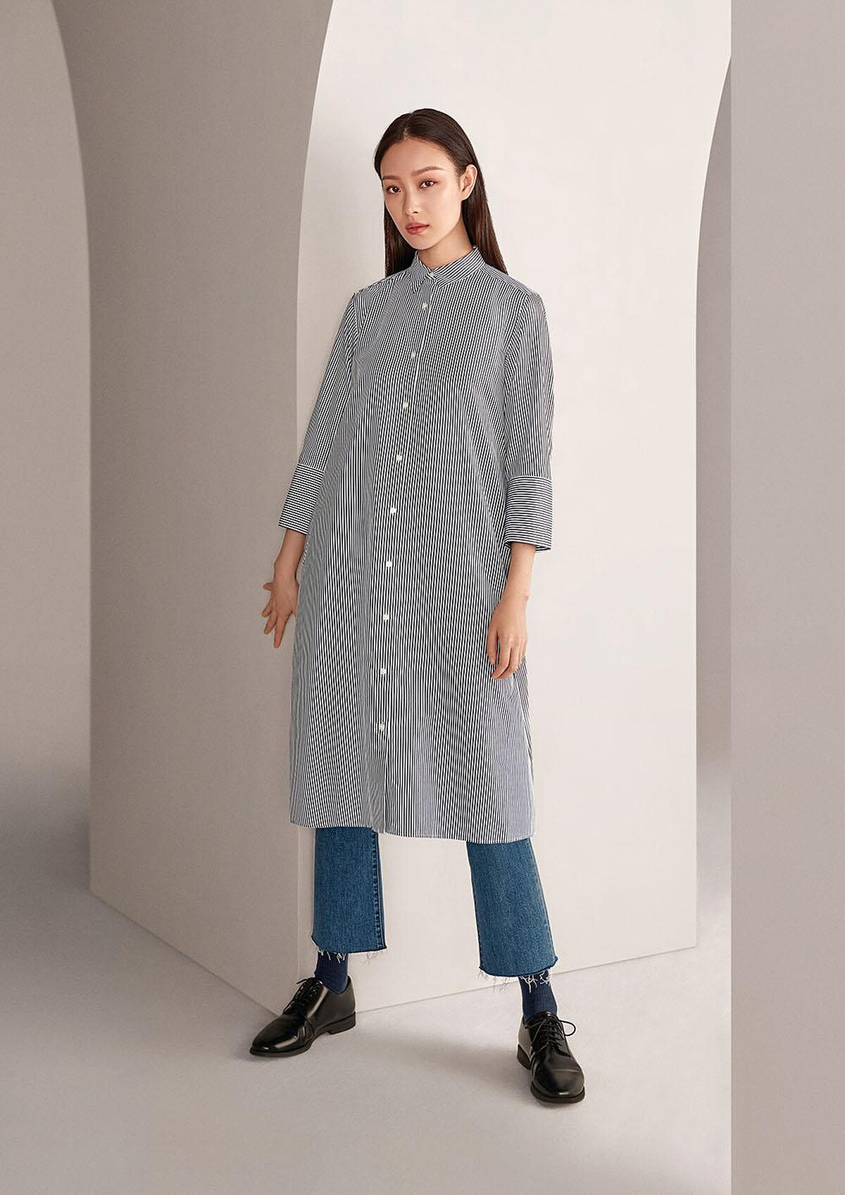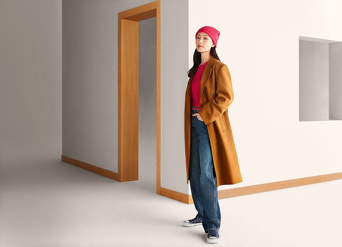 另外也有小喇叭丹寧褲,微微喇叭的設計讓人人都能輕鬆駕馭,中國區代言人倪妮搭配長版襯衫的造型,率性又俐落。