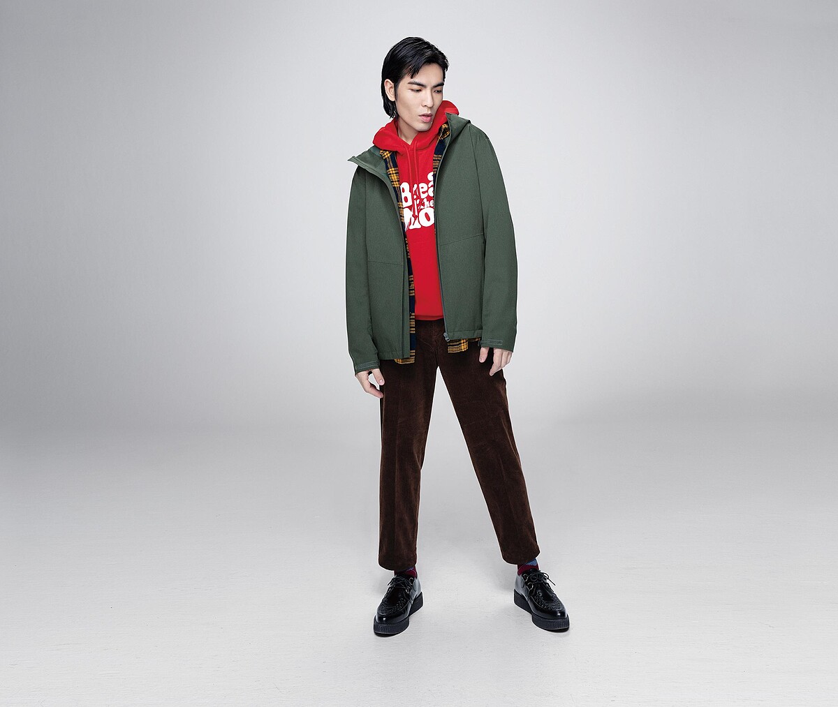 男裝部分,台灣宣布由蕭敬騰出任年度代言人,以新美學、新設計、新輪廓三大概念詮釋三套秋冬新裝,第一套「新美學」身穿搶以的紅色連帽上衣,外搭軍綠軍裝外套和絨面咖啡色長褲,呈現運動風結合軍裝風的時髦LOOK。