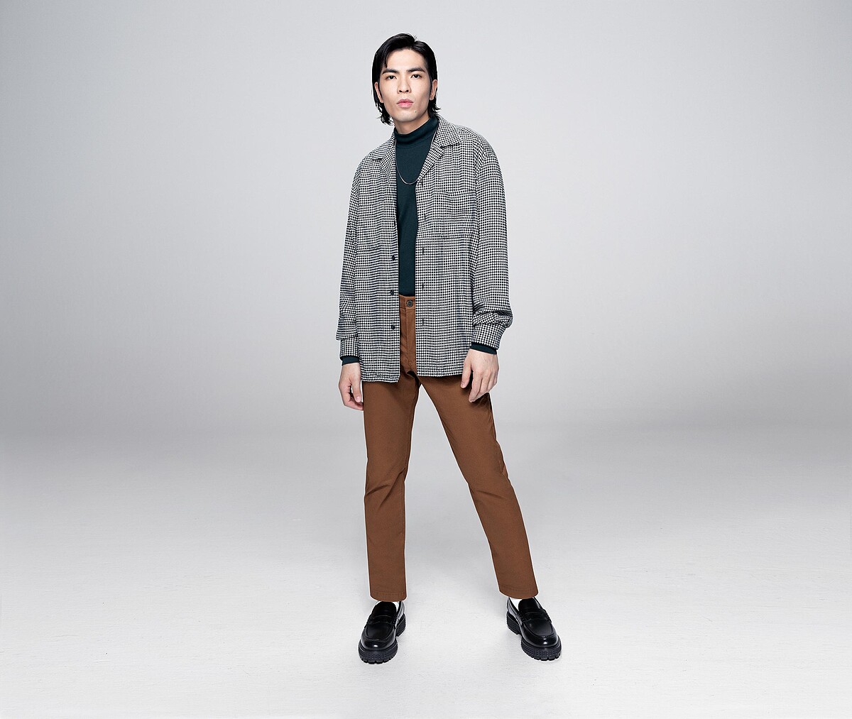第二套「新設計」主題是老蕭最喜歡的一套穿搭,他表示經典與設創新的新碰撞,就像老歌翻唱一樣,這身經典寬版法蘭絨開領襯衫搭配全新Slim Fit卡其褲的裝扮,帥氣又俐落。
