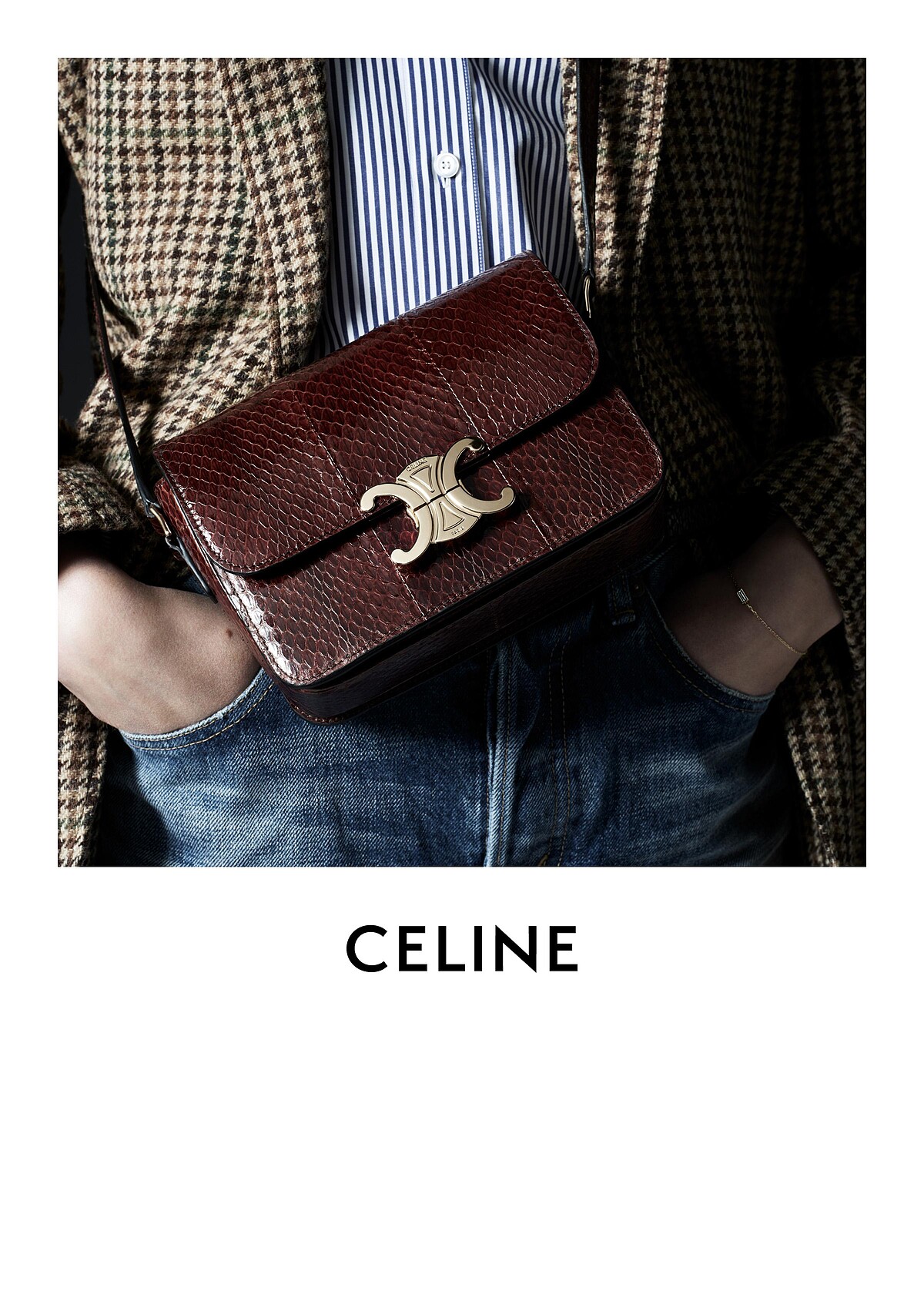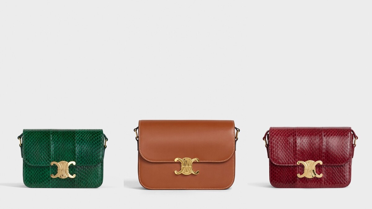而它最具標誌性的設計就是那略帶復古味道的華麗鎖釦,原來它是有歷史底蘊的,源自於品牌創辦人CELINE VIPIANA在一次車子拋錨經驗中,受到眼前圍繞凱旋門的TRIOMPHE鎖鏈啟發,進而使用於1970年代CELINE的官方圖徽中,HEDI SLIMANE將它改造後重新用於TRIOMPHE包上,用珍稀皮革與光滑小牛皮材質製作的俐落包身,加上三大隔層、拉鏈暗袋、易抽取卡槽的實用空間,以及可調節式的背帶,無論是休閒出遊或是正裝場合都適合。早秋系列新推了像是勃根地紅、陶瓦色、赭黃色、焦糖色、青瓷色以及石灰色等充滿秋意的時髦新色,包包控們可得小心荷包又被燒到了!