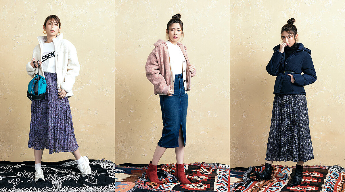 丹寧過膝窄裙搭配腳踝靴洋溢著濃濃美式復古風情,優美輪廓添加內理特殊刷毛材質與延展性的功能,加上針織與粉嫩刷毛外套的組合,完美展現率性又甜美的女孩氣質;百褶裙也是秋冬持續當紅的人氣單品,輕盈飄逸質感更顯優雅,再配搭上售價僅NT$1490的鋪棉外套,輕盈保暖,沉穩地將統一色調搭配得十分高雅,是一種截然不同、洗練又時髦的大人系風格!