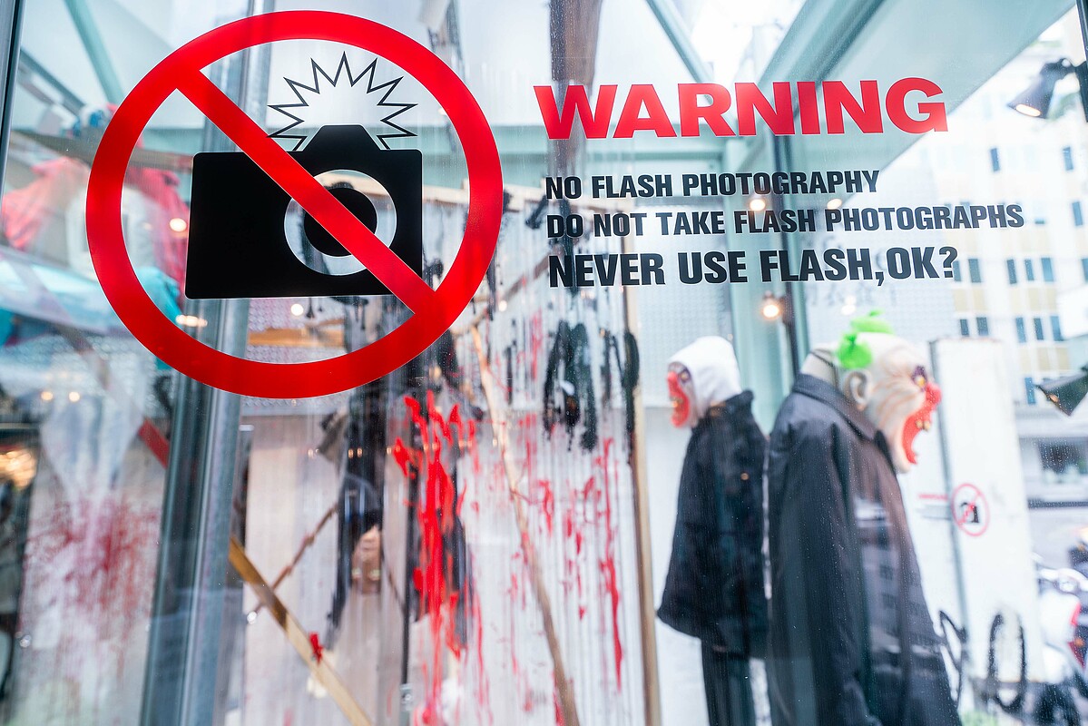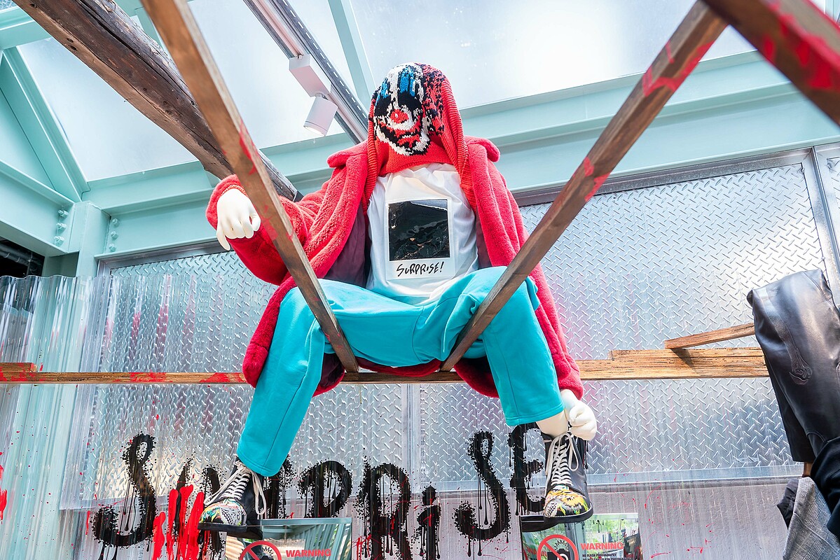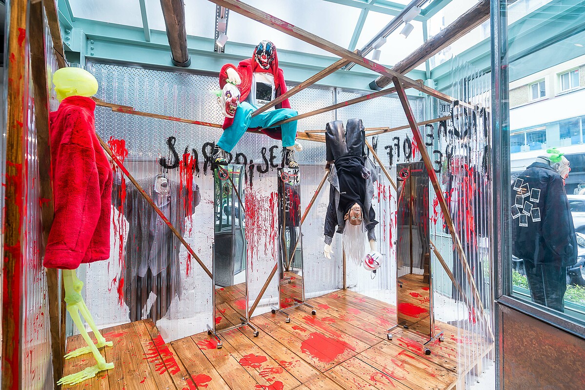 正逢農曆七月的時節,如果你經過東區的onefifteen初衣食午的櫥窗可別被嚇到了,鬼魅的小丑、血腥的佈置,讓人忍不住多往裡頭瞄兩眼,仔細定睛一看,人台身上的服裝倒是挺時髦,原來是日本潮流品牌doublet的主題裝置。
