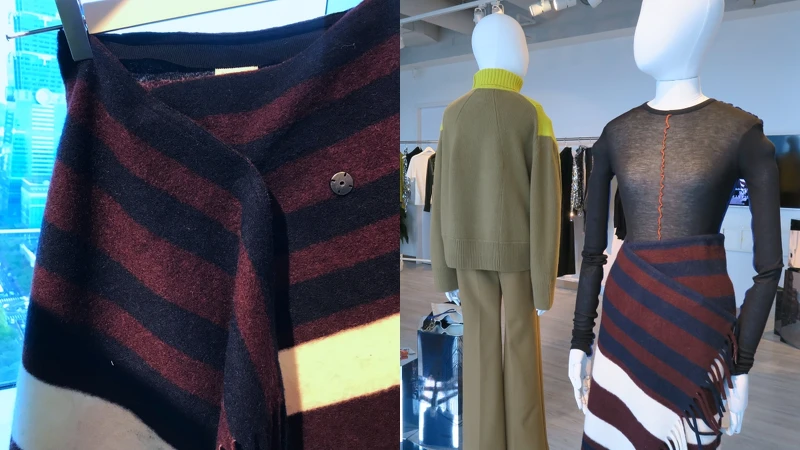 此外,本季大量使用的羊毛混紡織物上也出現了擷取自圍巾兩端的毛線流蘇,無論是在鏤空鉤針的短版毛衣、前短後長的厚實毛衣、抑或是大衣和裙子,都可見到這隨著每個步伐搖擺的身影。特別的是,那件稱作裙子的設計,其實也可變化為寬大的圍巾,女孩們只需將縫於上頭的暗扣解開,便可輕鬆以不同的方式穿戴,既實用又時髦!