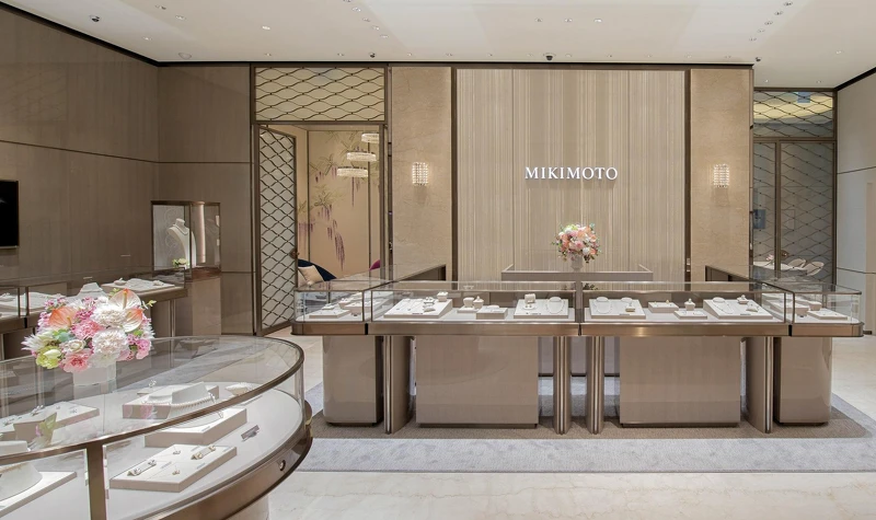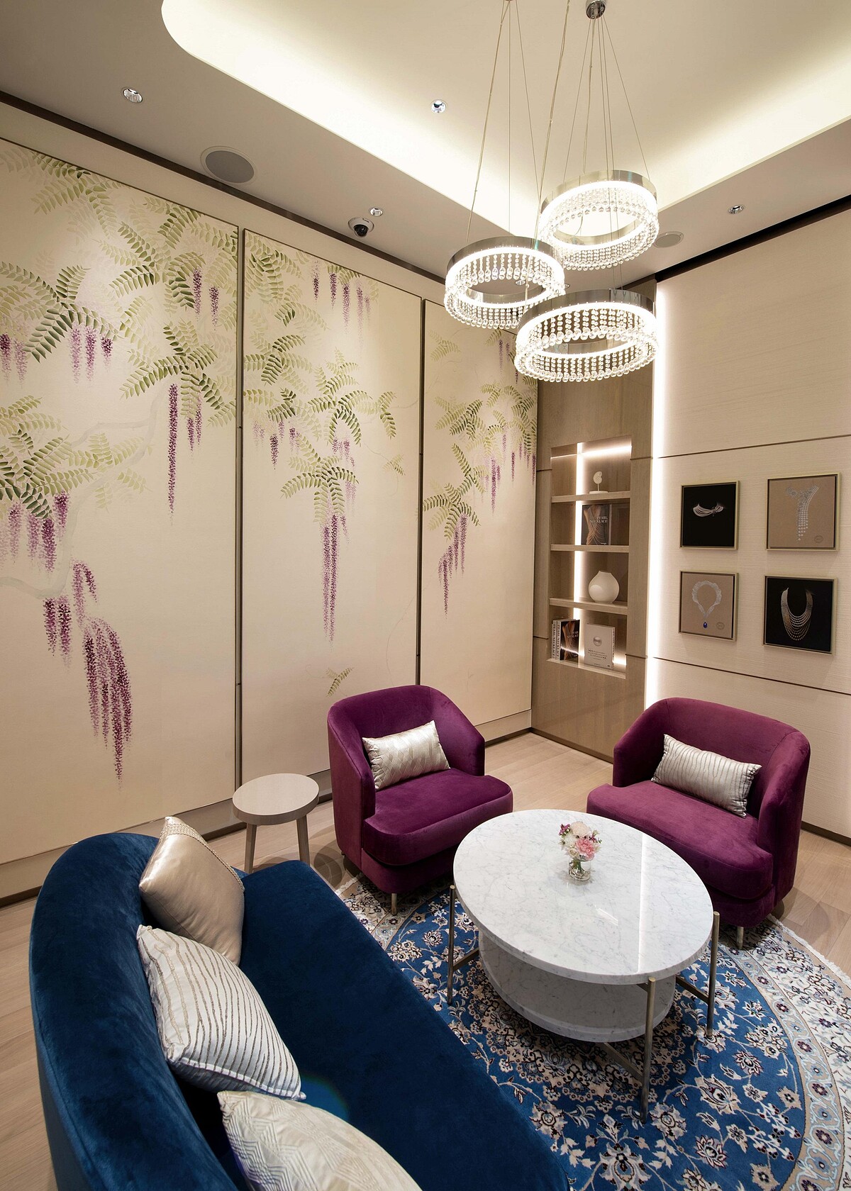 推開旗艦店大門,便能看見MIKIMOTO獨有的和諧典雅氛圍;VIP室牆面則採用來自歐洲純手工繪製壁紙,清麗典雅的紫藤花,展現浪漫醉人的日式風情。