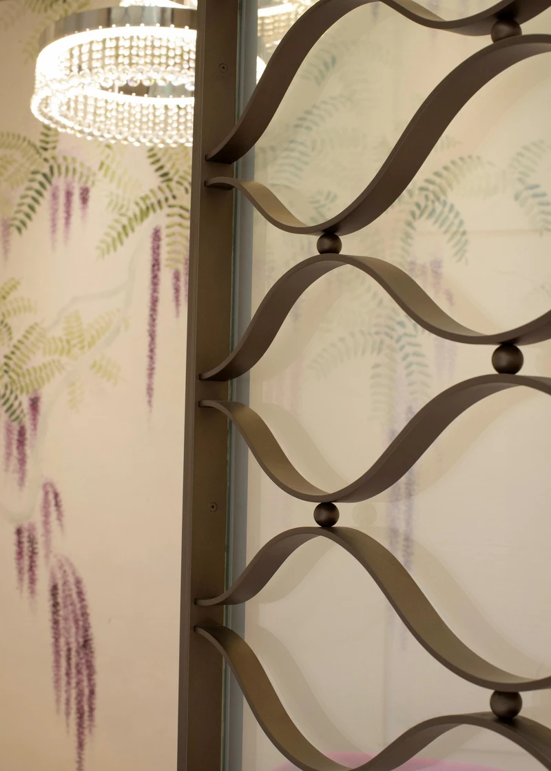 窗櫺與門廊的鐵件設計採金色波浪線條,靈動起伏、堆疊生動的美感,波狀線條交錯間點綴圓形珍珠的設計,猶如深海的壯麗海浪般。