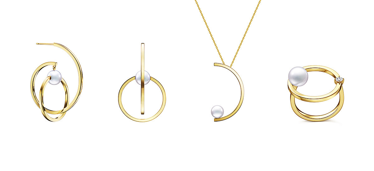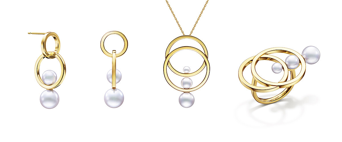 TASAKI kinetic 珍珠黃K金耳環、項鍊與鑽石戒指。
